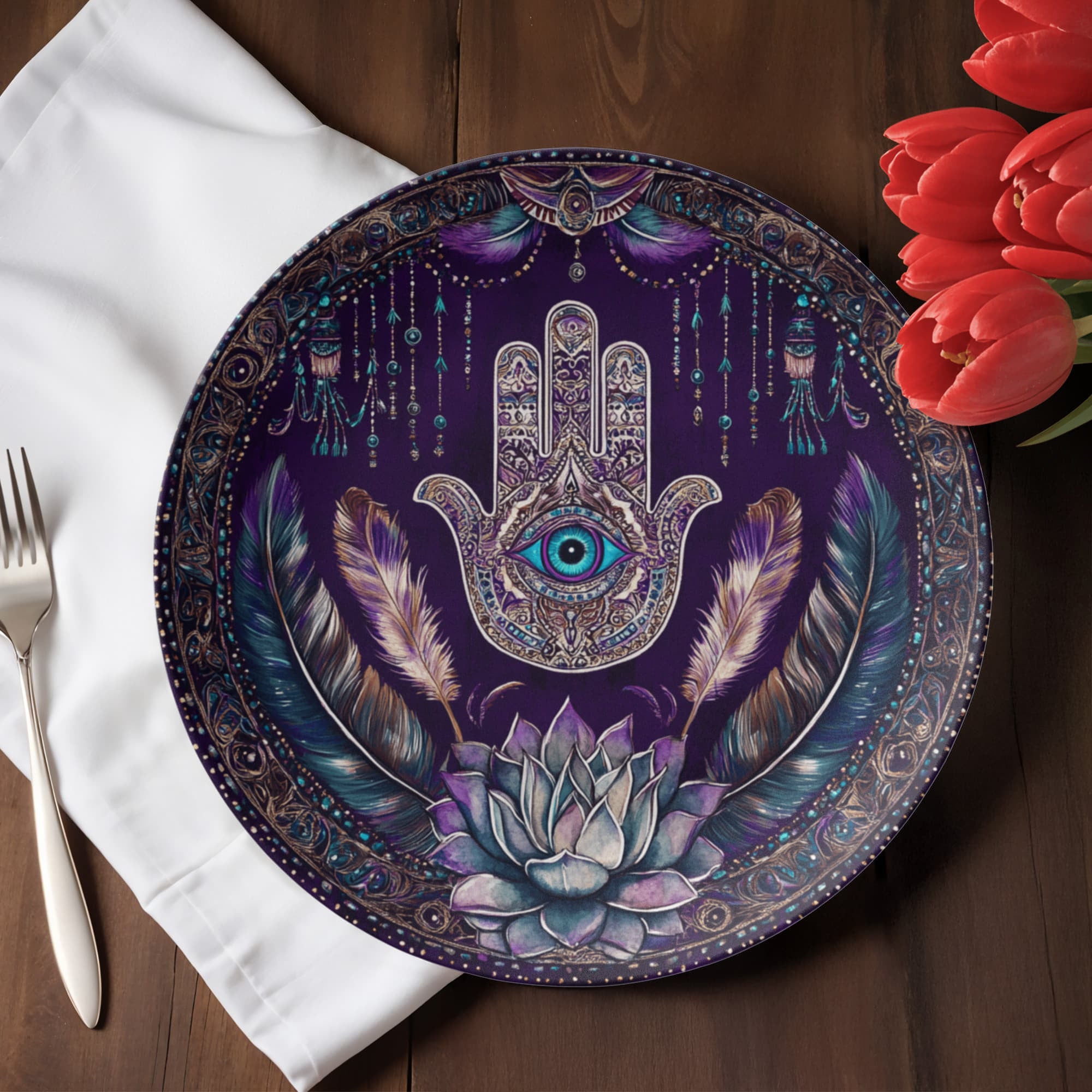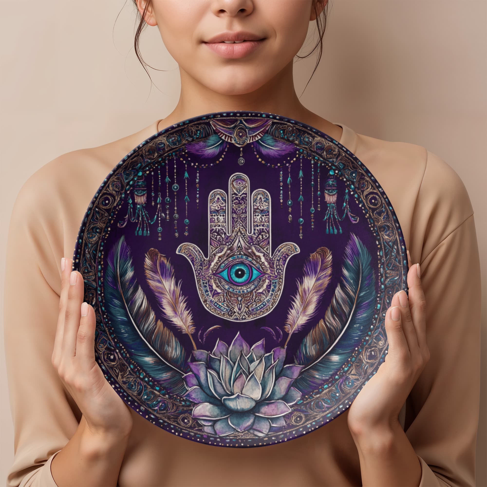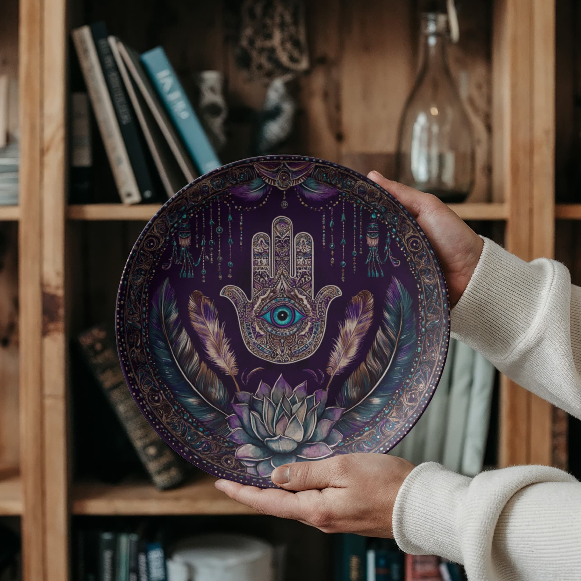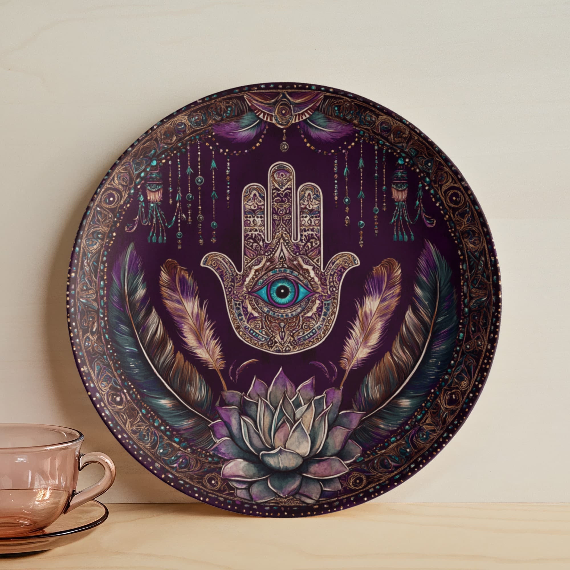 Mystic Hamsa Hand Decorative Plate – Boho Eye & Feather Wall Art (10")
