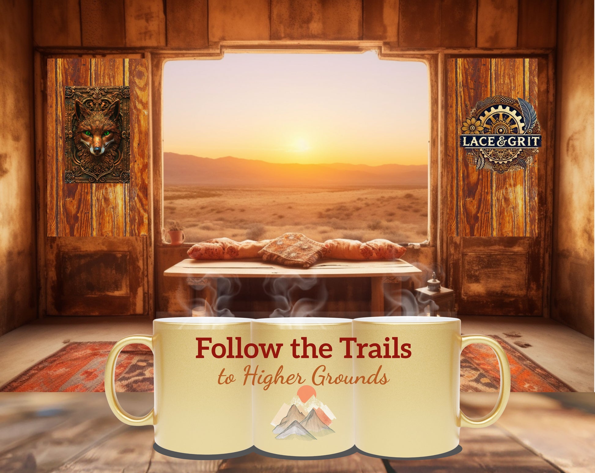 Elevate your morning with this metallic-finish ceramic mug that glows like a mountaintop sunrise. Featuring the phrase “Follow the Trails to Higher Grounds” and a minimalist mountain illustration, this mug blends adventure and aesthetic in one bold sip.