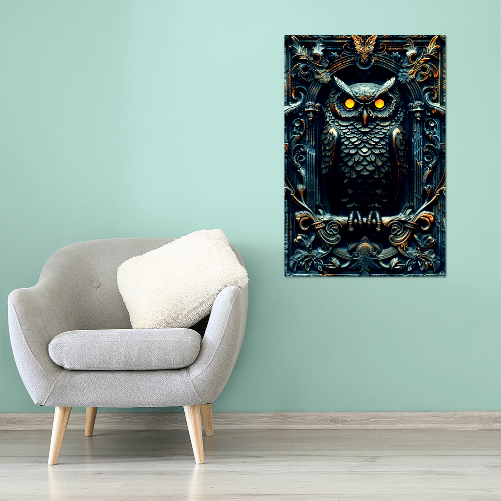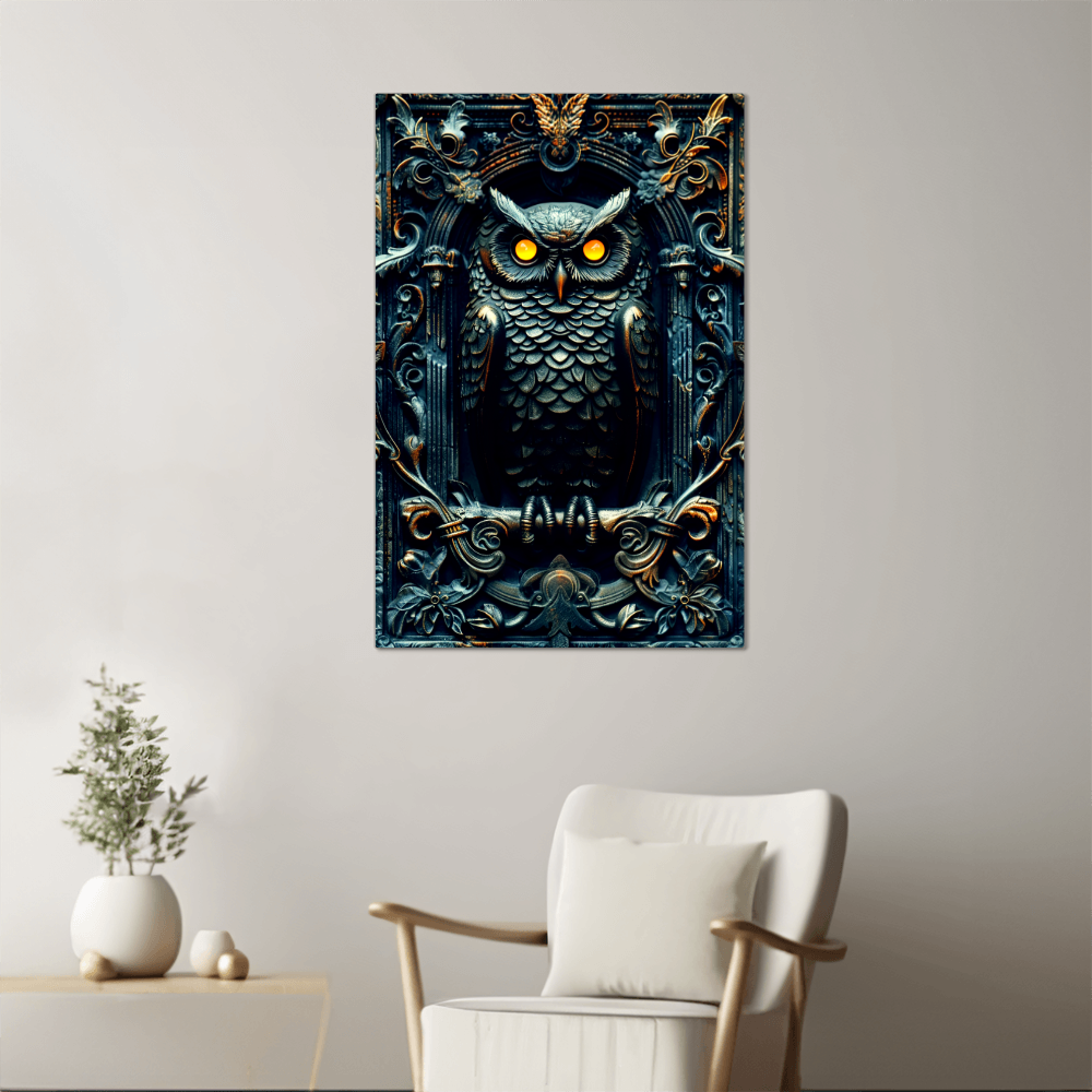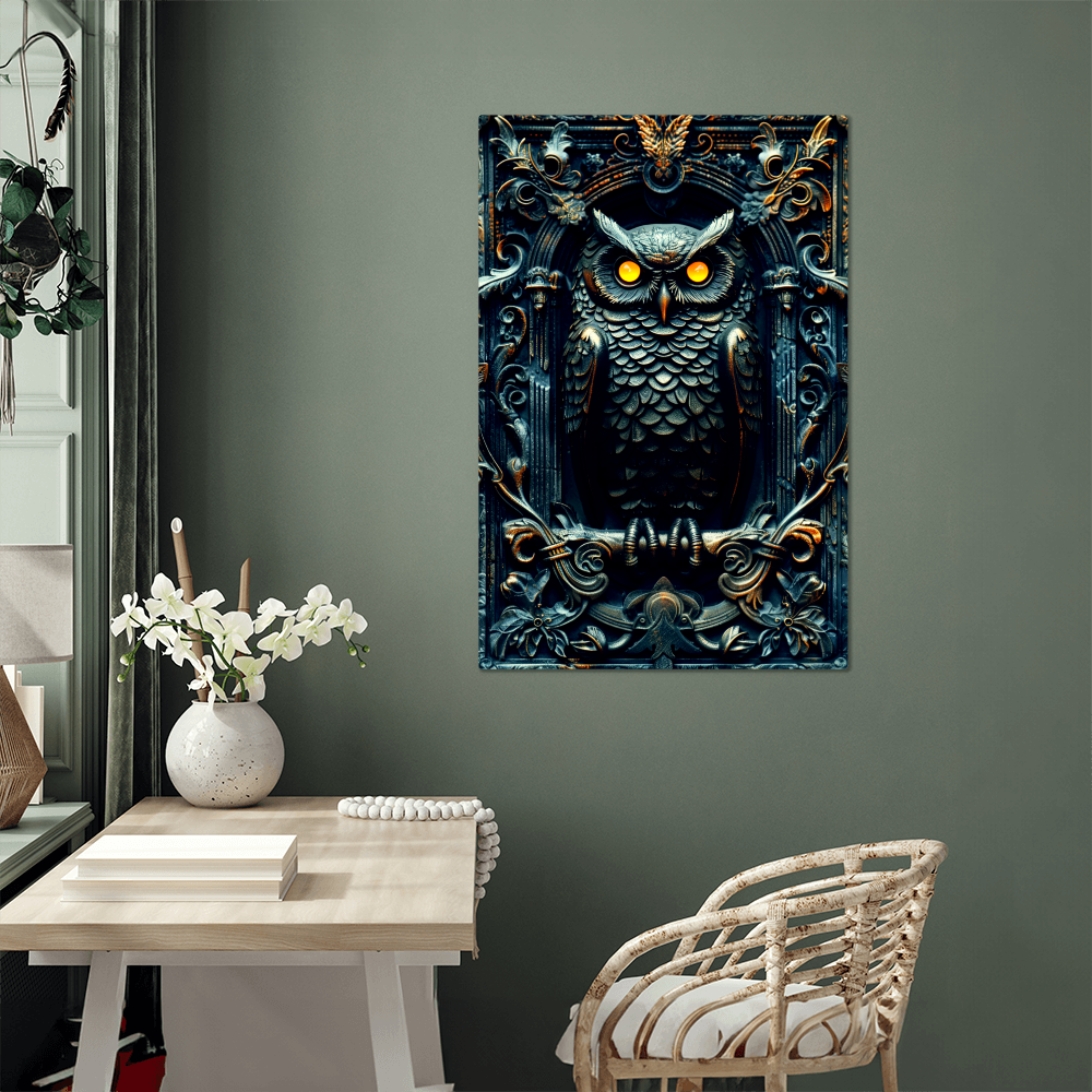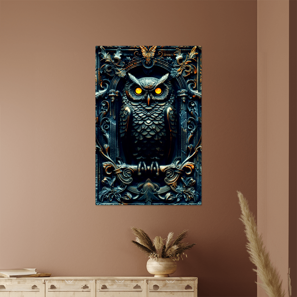 Noctyra | Owl Metal Wall Art – High Gloss Print with Ornate Gothic Frame (Not 3D Embossed)