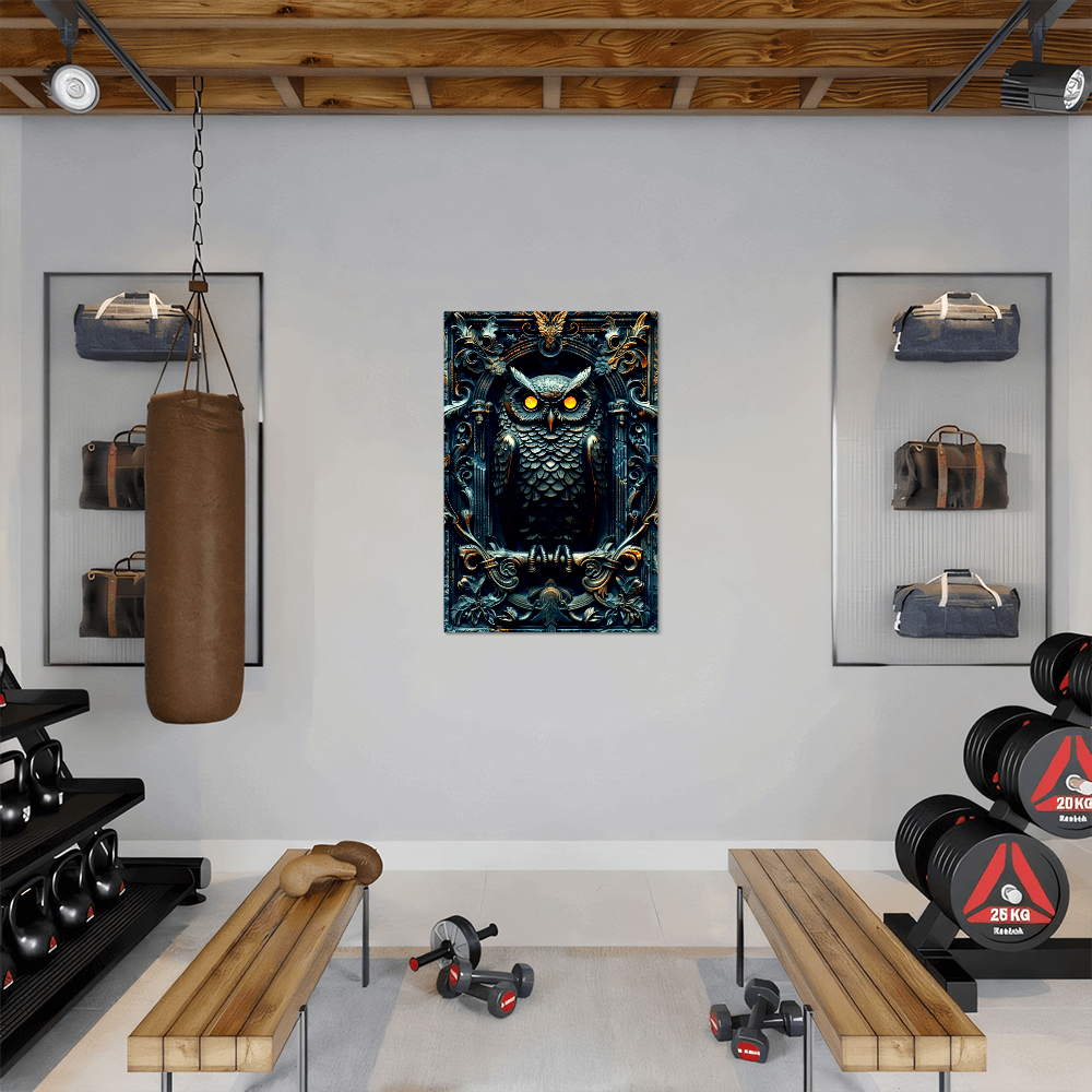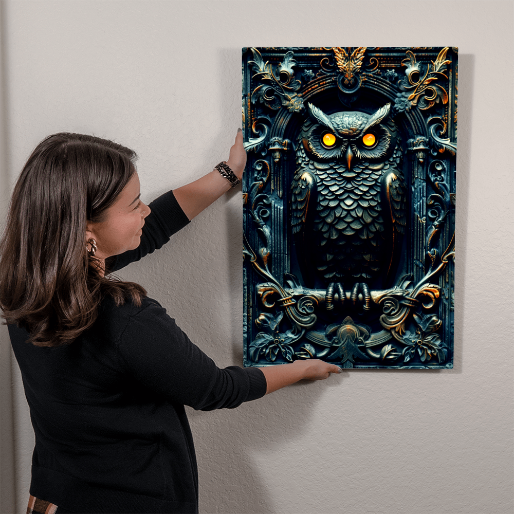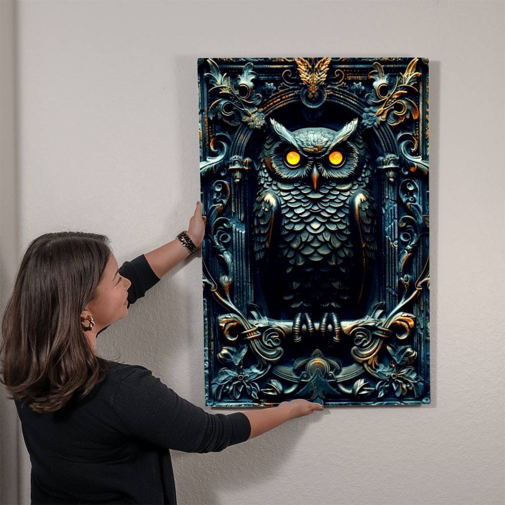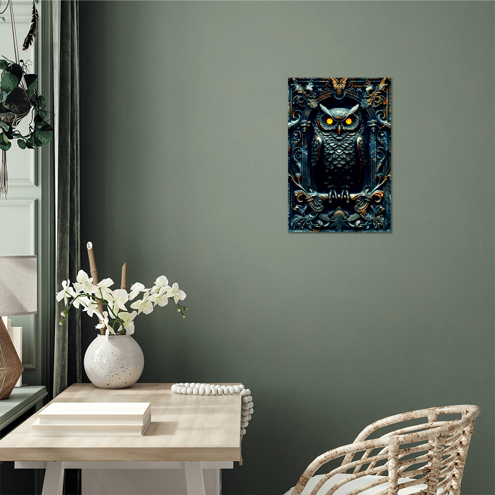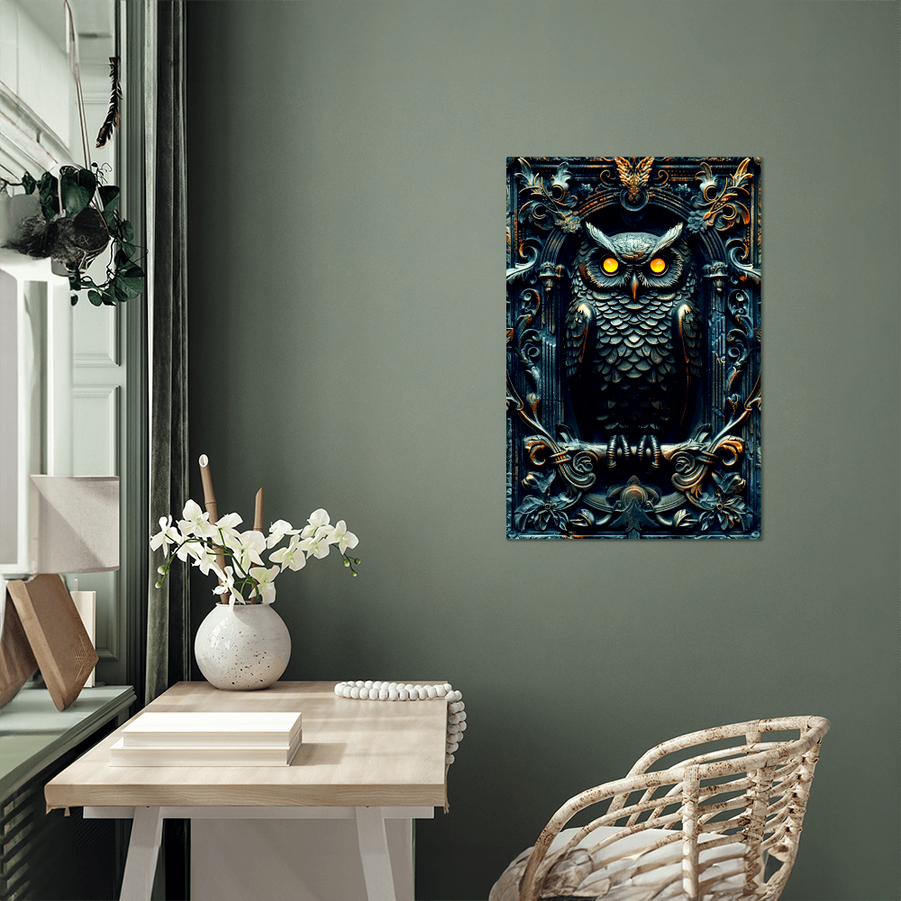 Noctyra | Owl Metal Wall Art – High Gloss Print with Ornate Gothic Frame (Not 3D Embossed)