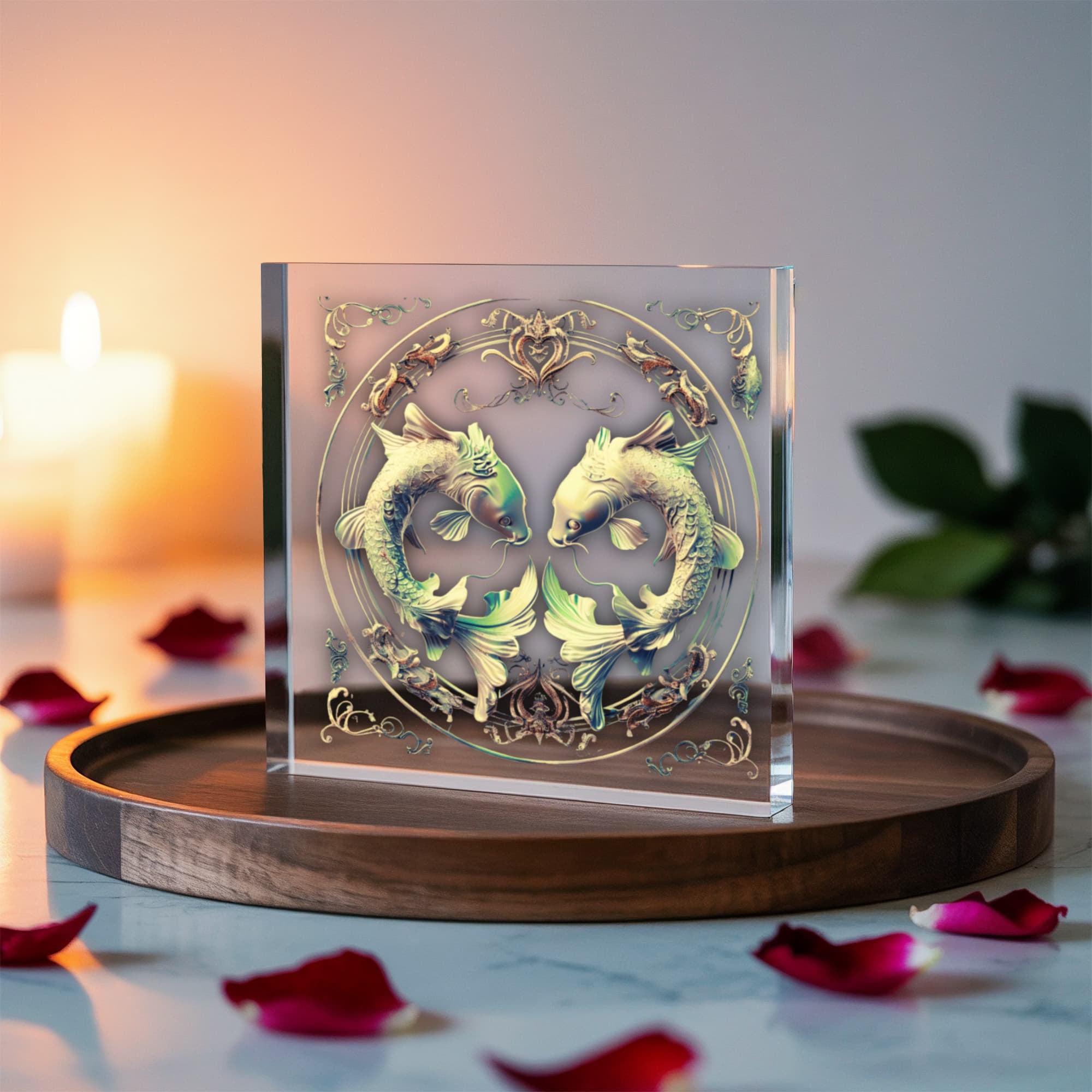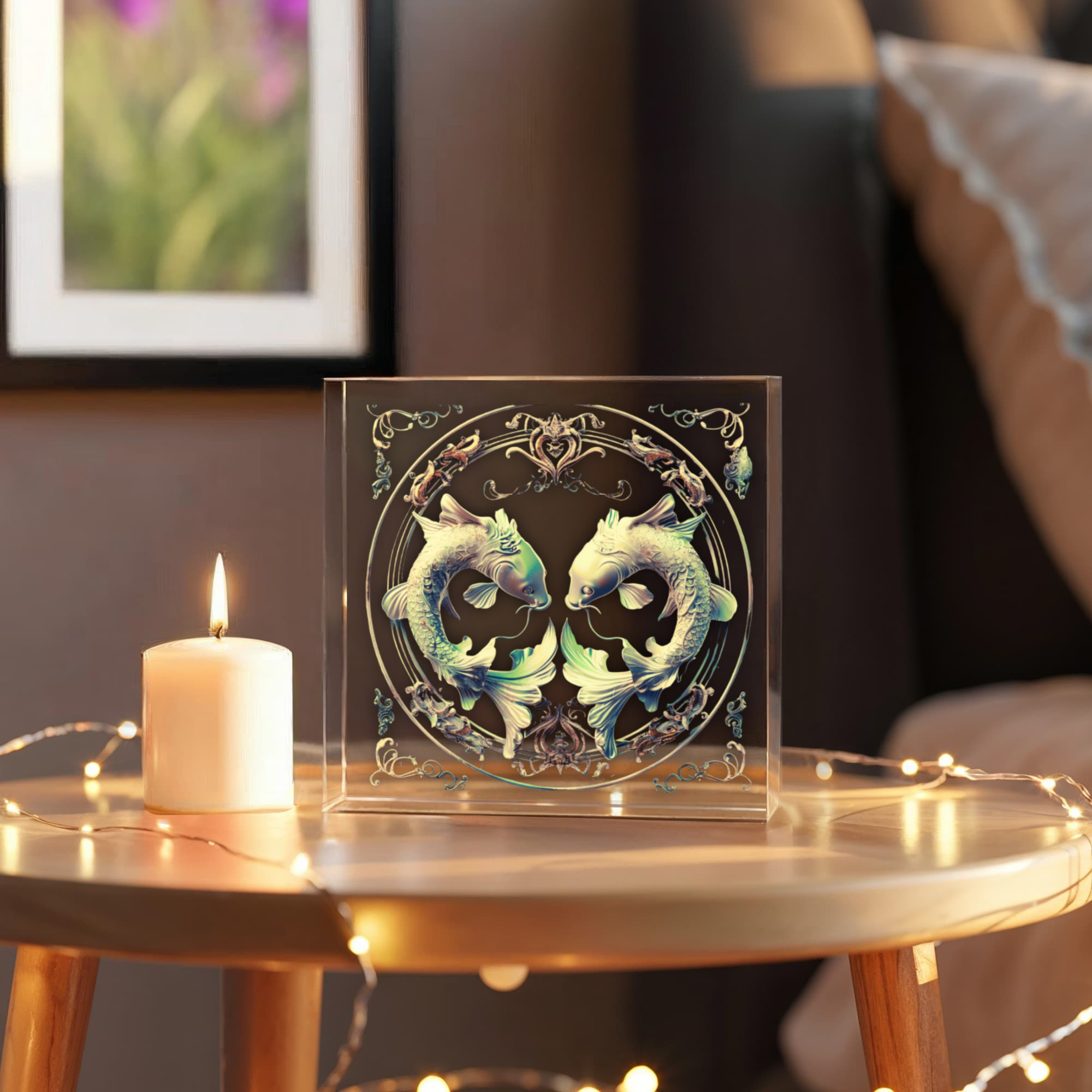 Drift into the dreamy depths of Pisces with this enchanting Zodiac Art Block. Featuring two gracefully intertwined fish surrounded by ornate filigree and celestial flourishes, this design captures Pisces’s sensitivity, imagination, and spiritual flow. The printed metallic-look artwork shimmers in pearlescent silver and soft aqua tones, creating a peaceful, reflective glow that changes beautifully with the light.