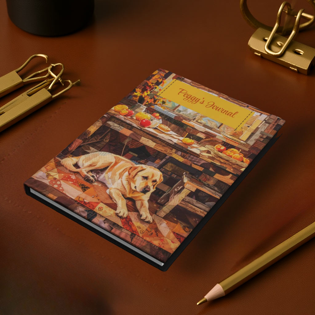 Celebrate golden days and loyal hearts with this Quilted-Look Yellow Lab Journal. The cover features a faithful Labrador resting on a patchwork floor beside a rustic farmhouse table filled with apples, pumpkins, and warm autumn light. The quilted-look design captures the feeling of home and comfort—vividly printed in color and smooth to the touch.