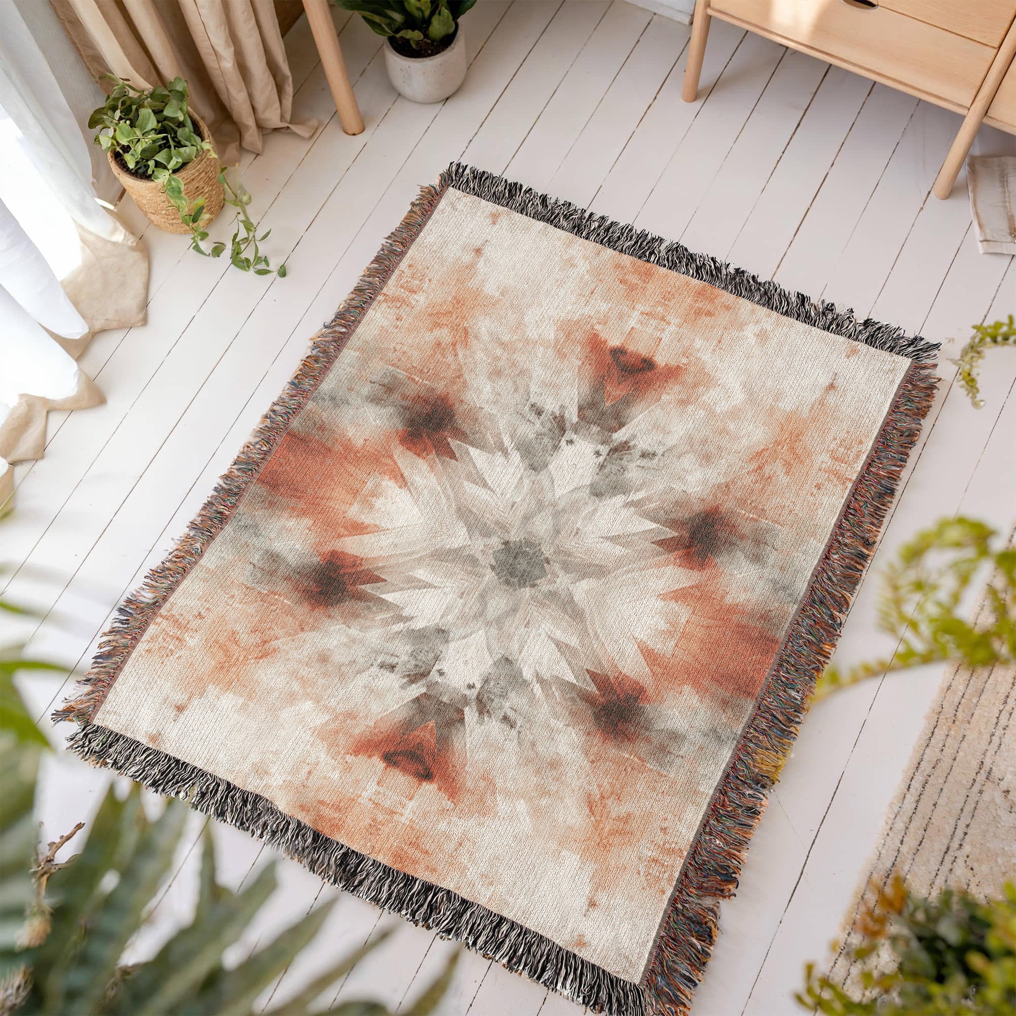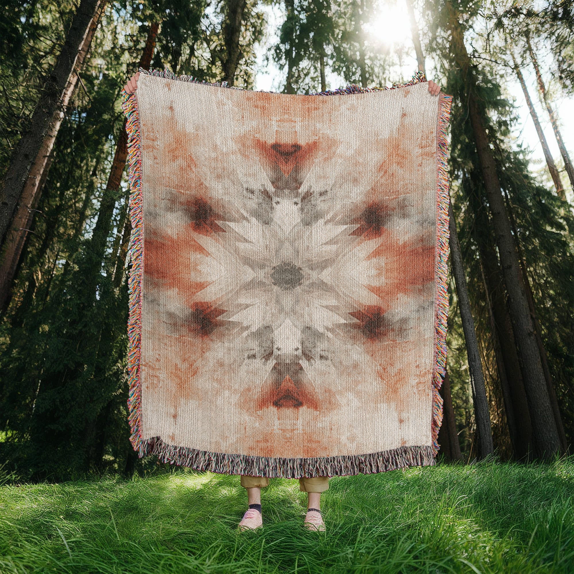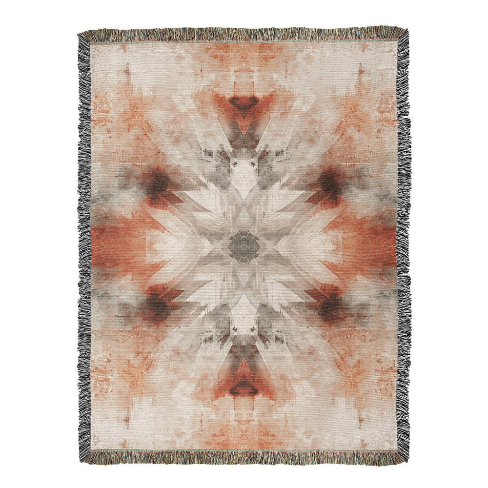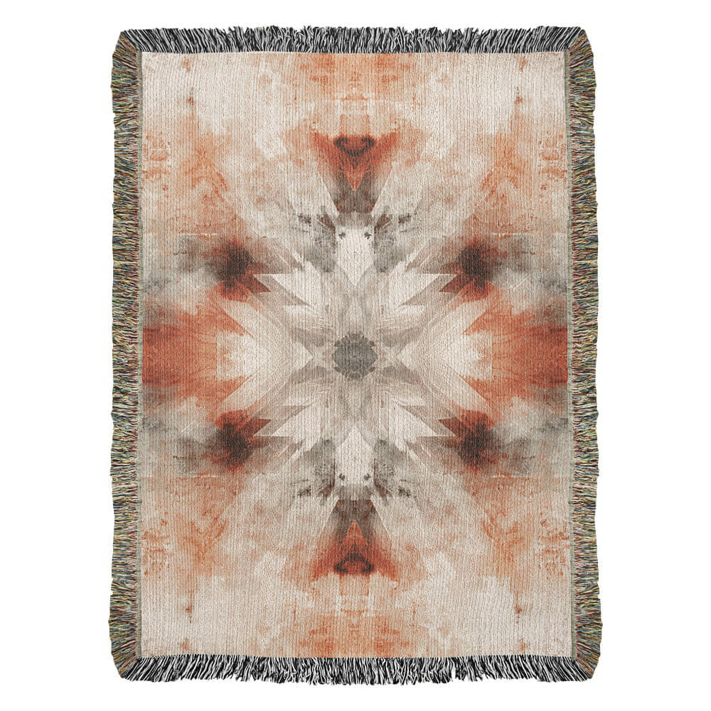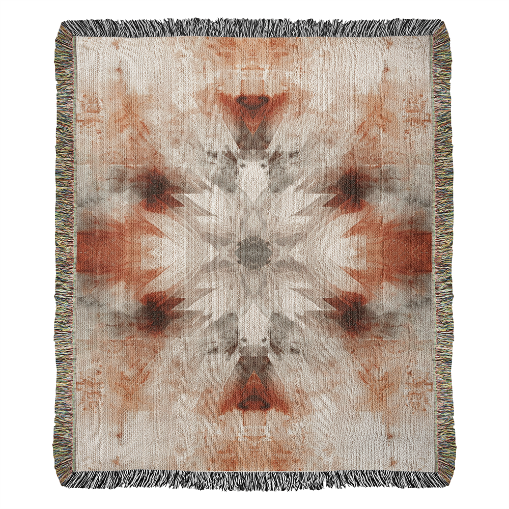 Rooted in ceremony and shaped by the elements, the Red Earth Ritual woven blanket radiates tribal symbolism through a dreamlike, watercolor burst. Warm rust tones mix with smoky grays and faded ivory, forming a mirrored sunburst that feels both powerful and serene. It’s a statement piece with sacred energy and modern softness.