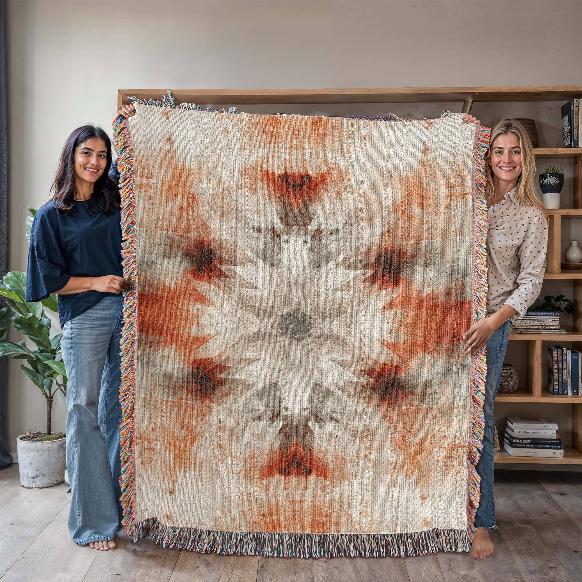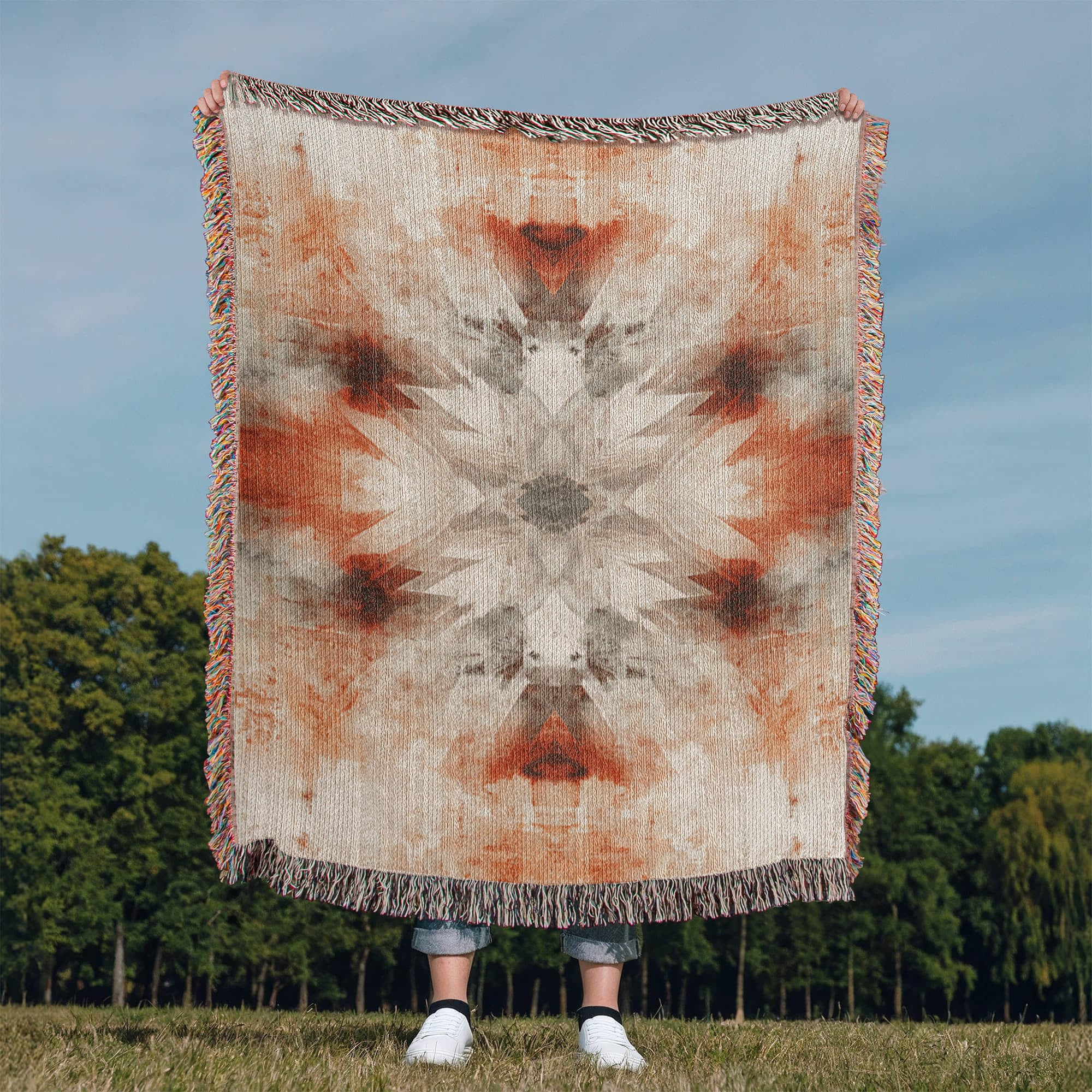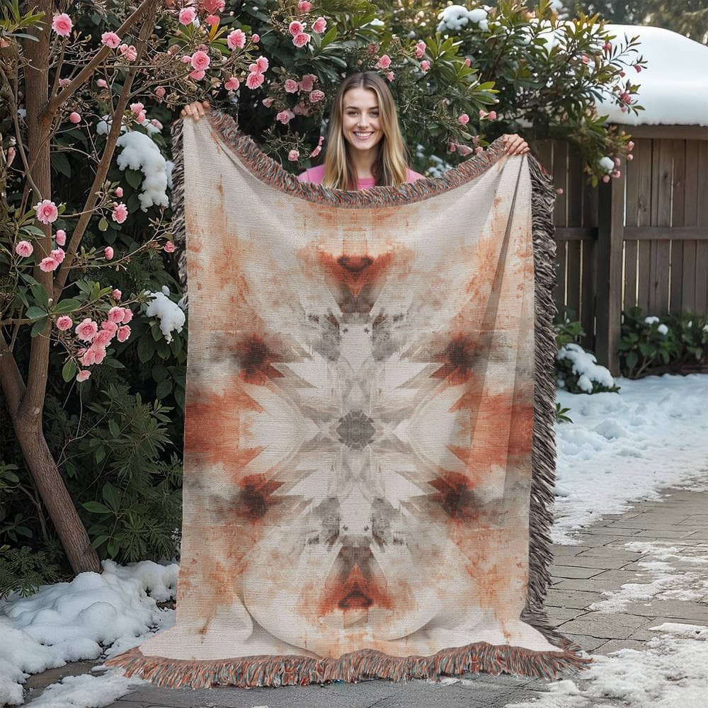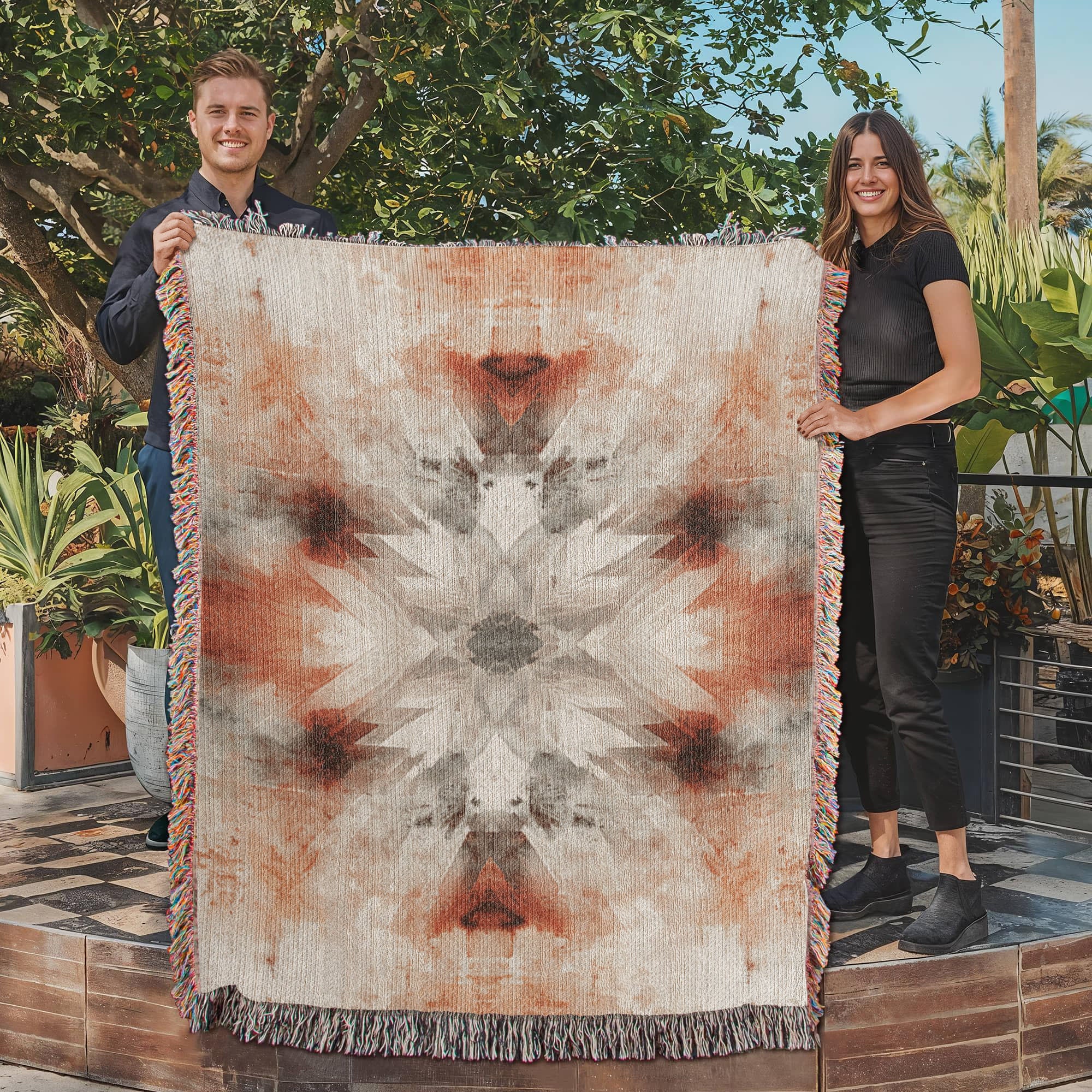 Rooted in ceremony and shaped by the elements, the Red Earth Ritual woven blanket radiates tribal symbolism through a dreamlike, watercolor burst. Warm rust tones mix with smoky grays and faded ivory, forming a mirrored sunburst that feels both powerful and serene. It’s a statement piece with sacred energy and modern softness.
