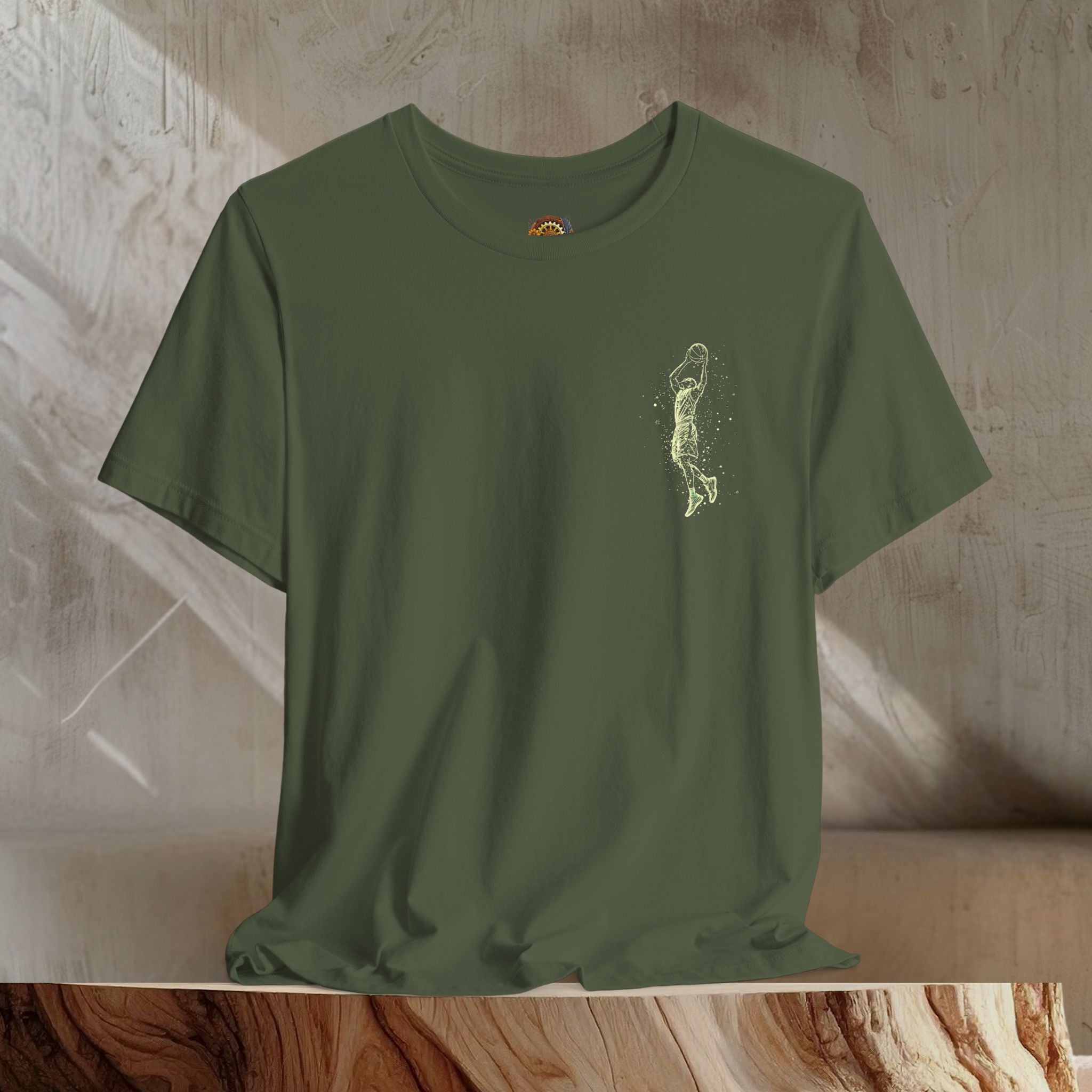 This minimalist basketball t-shirt captures the frozen moment just before release—focus, lift, and instinct meeting midair. The player is rendered in glowing golden linework, suspended against deep, dark fabric tones to symbolize discipline, repetition, and the quiet grind behind every great shot.