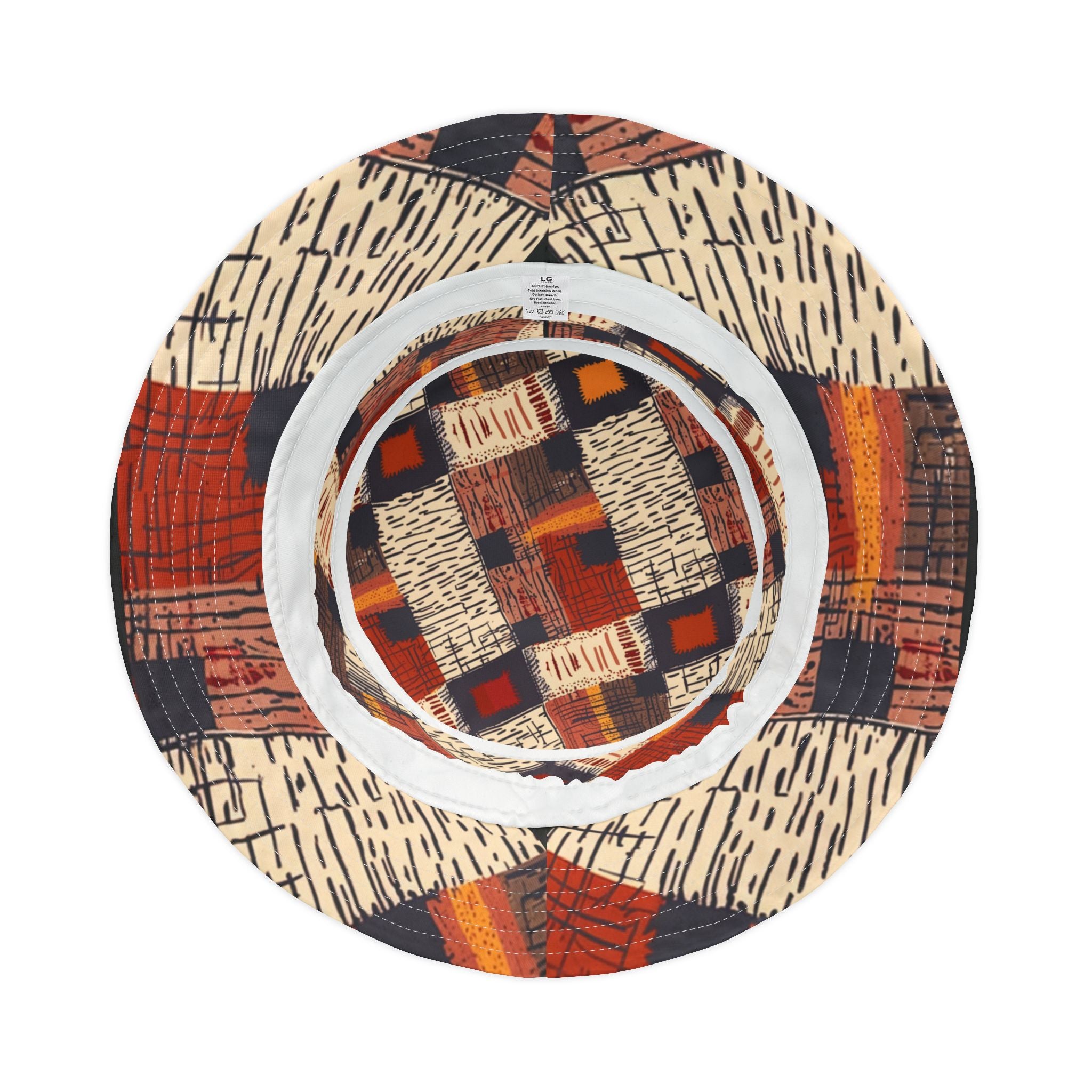 Rustic Rhythm Bucket Hat Celebrate your creative side with this boho-inspired bucket hat featuring a patchwork pattern of stitched textures and hand-drawn lines. The warm russet and navy tones capture a cozy, artisanal energy that feels right at home from city streets to festival fields.