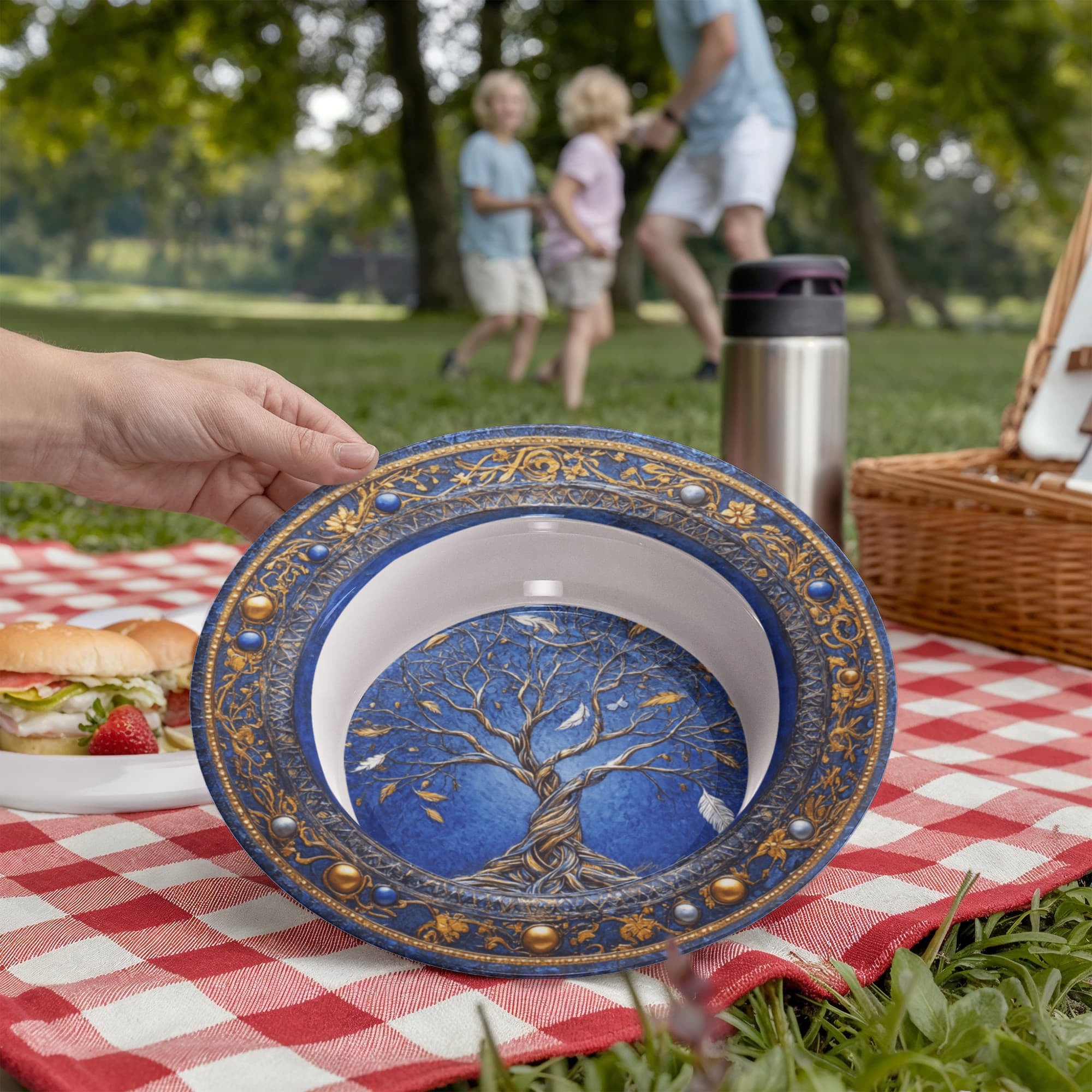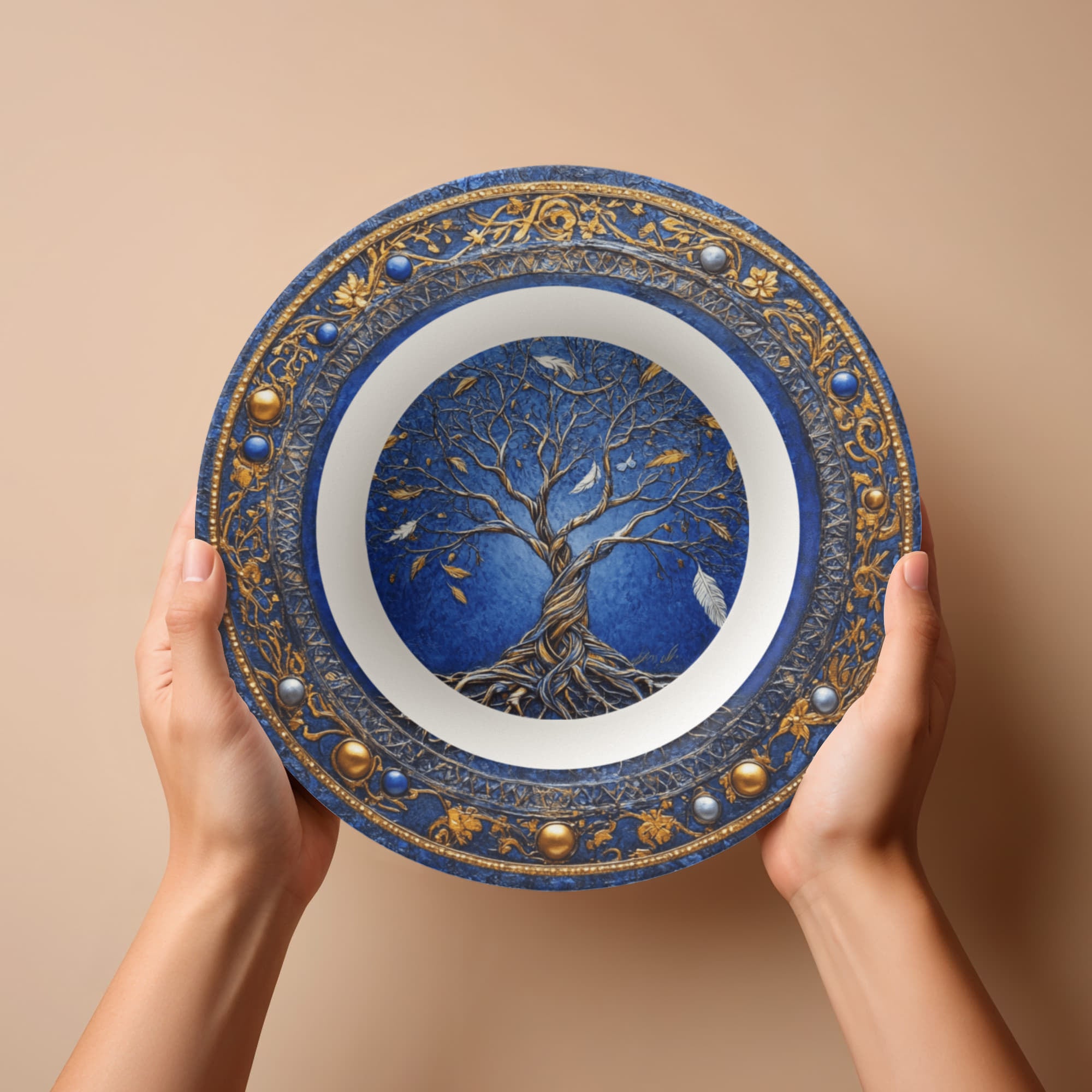 Ground your space in elegance with this intricate 8" decorative bowl featuring a golden Tree of Life set against a deep sapphire blue background. Delicate feathers float through the branches while a baroque-inspired rim adds richness and refinement. A beautiful pairing with your Sacred Circles plate set or as a meaningful standalone piece.