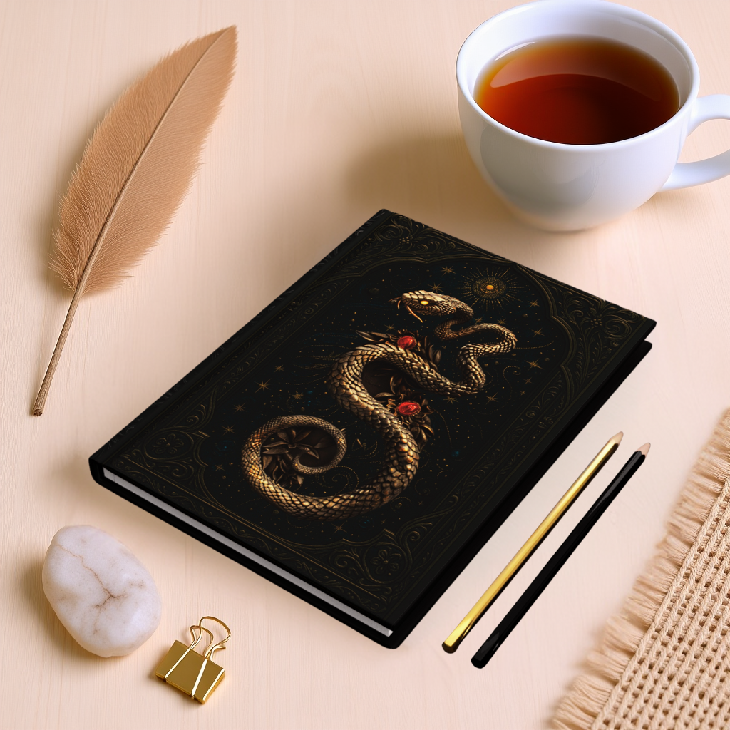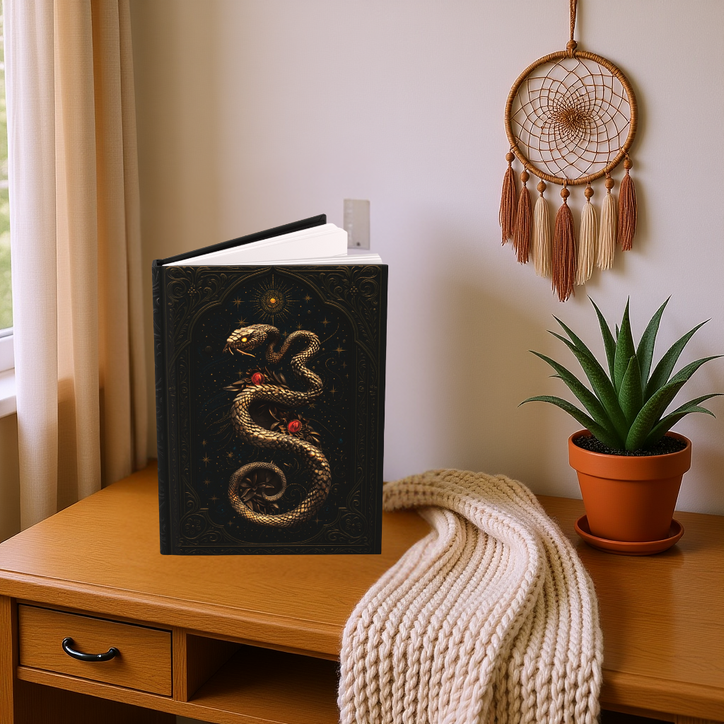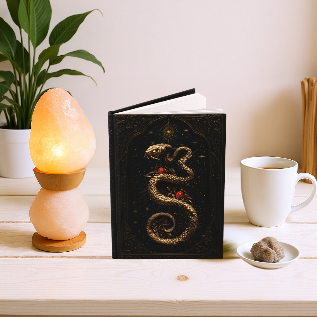 A journal wrapped in mystery, where secrets slither and stars guide your pen. This embossed-look serpent design weaves celestial wonder and ancient power into one striking hardcover—an enchanted place to record your dreams, spells, and sacred truths.