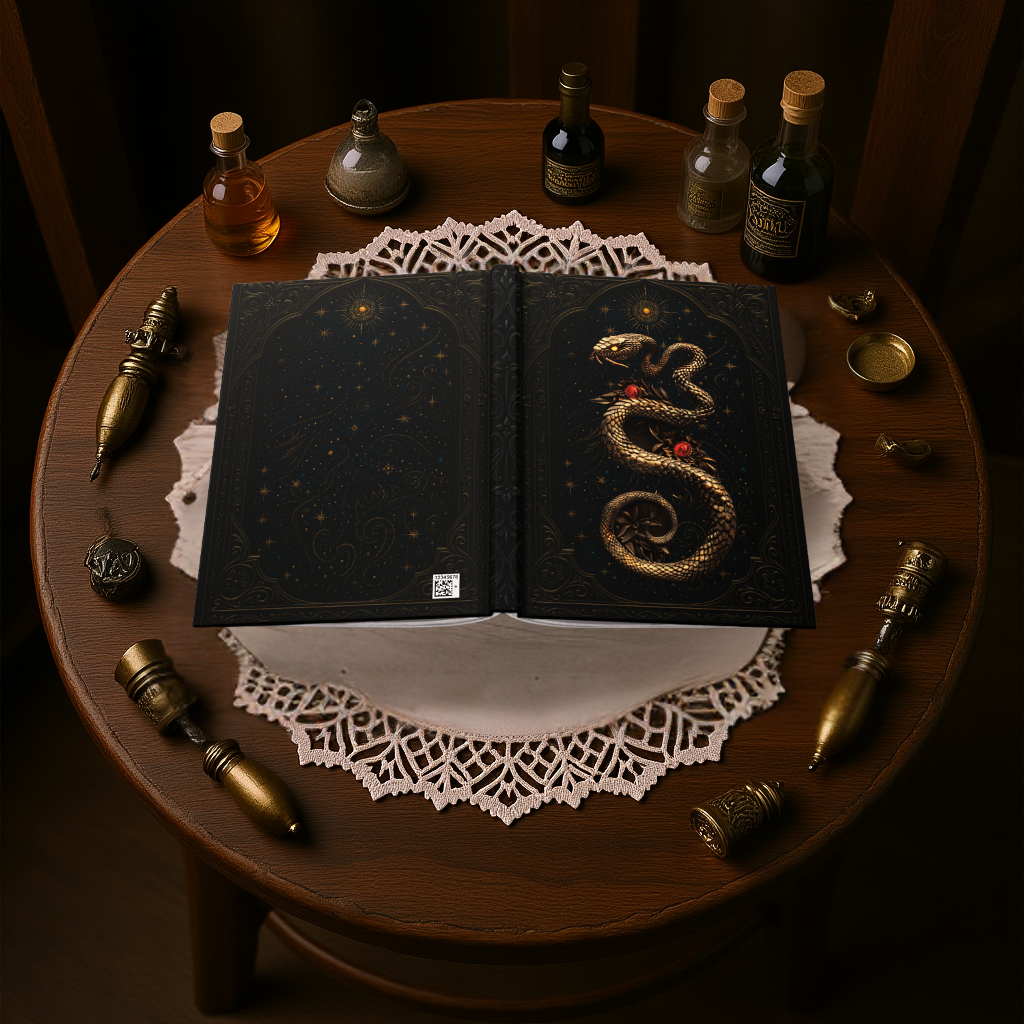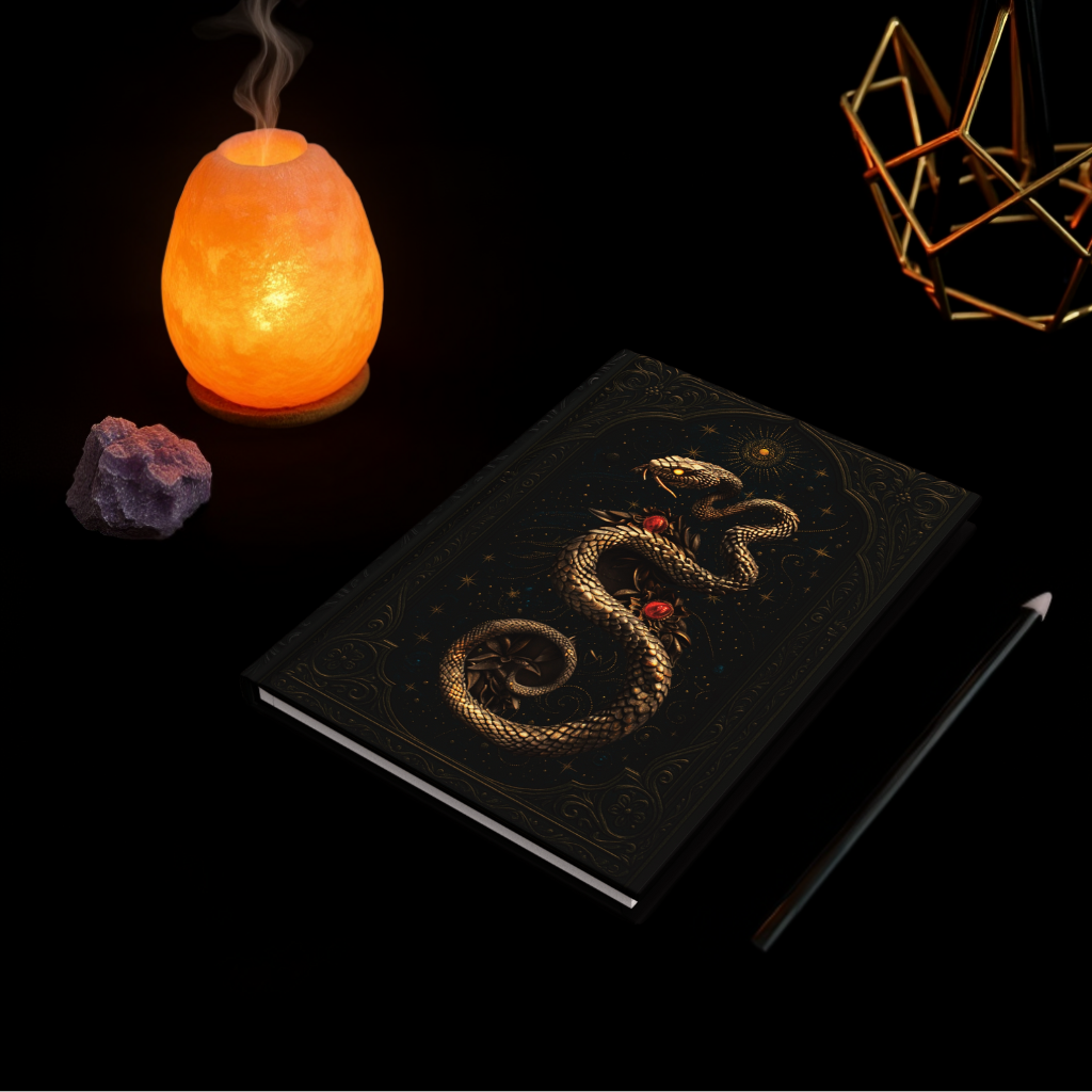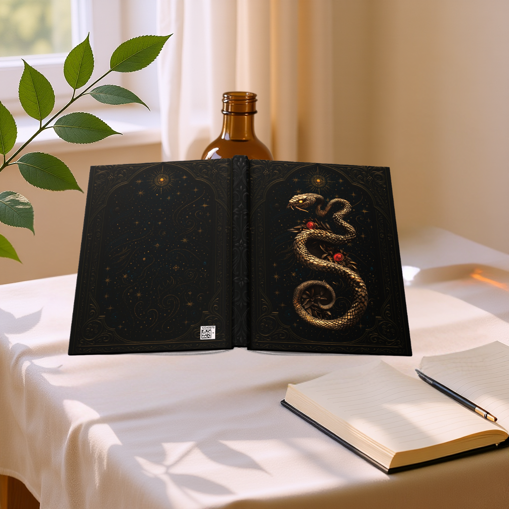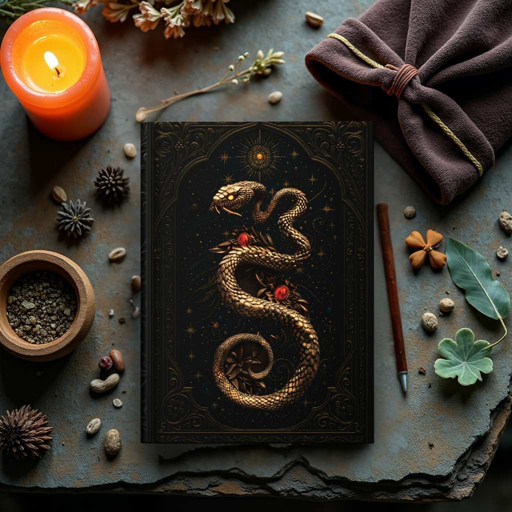 A journal wrapped in mystery, where secrets slither and stars guide your pen. This embossed-look serpent design weaves celestial wonder and ancient power into one striking hardcover—an enchanted place to record your dreams, spells, and sacred truths.