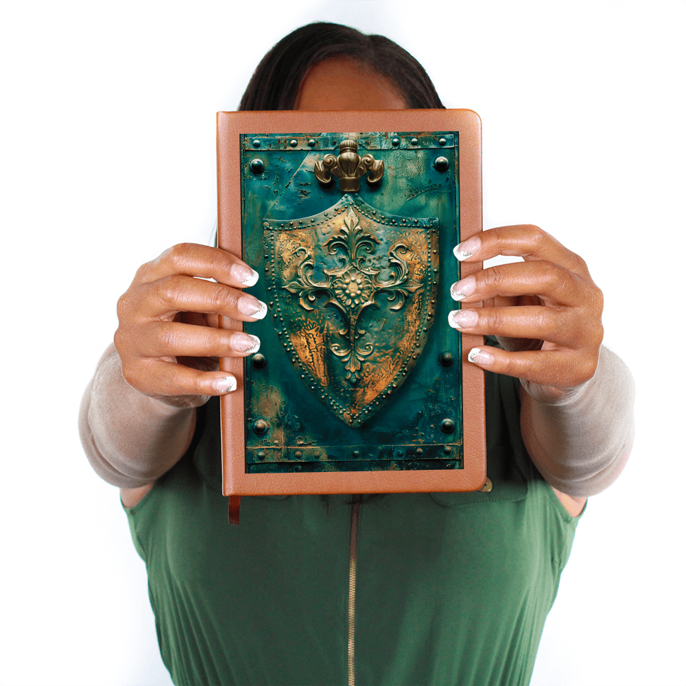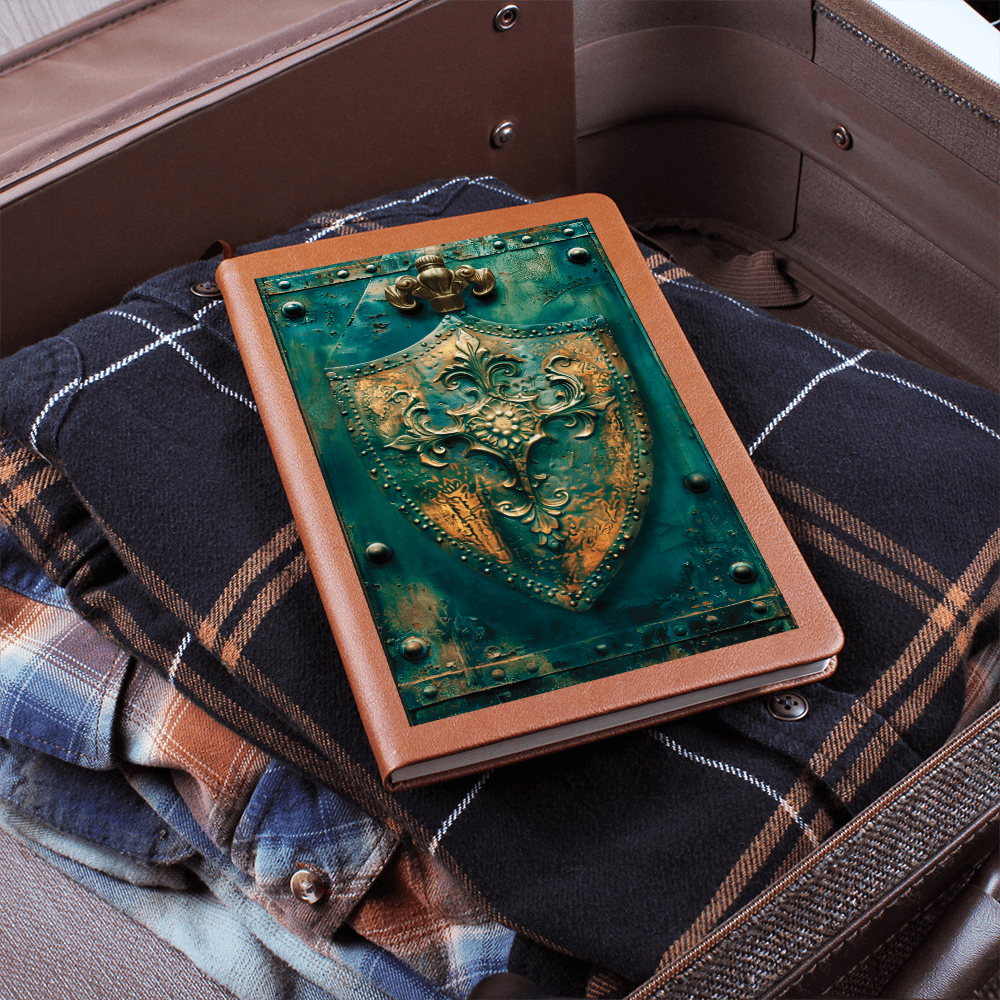 Defend your stories and secrets with this Shield Emblem Vegan Leather Journal. Featuring an ornate golden shield set against a weathered turquoise patina, this engraved-look design feels like it was forged in a medieval armory. Ideal for fantasy writers, RPG adventurers, and anyone who loves knightly legends, this piece is both functional and collectible.