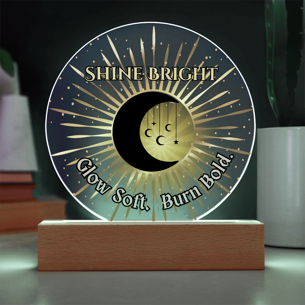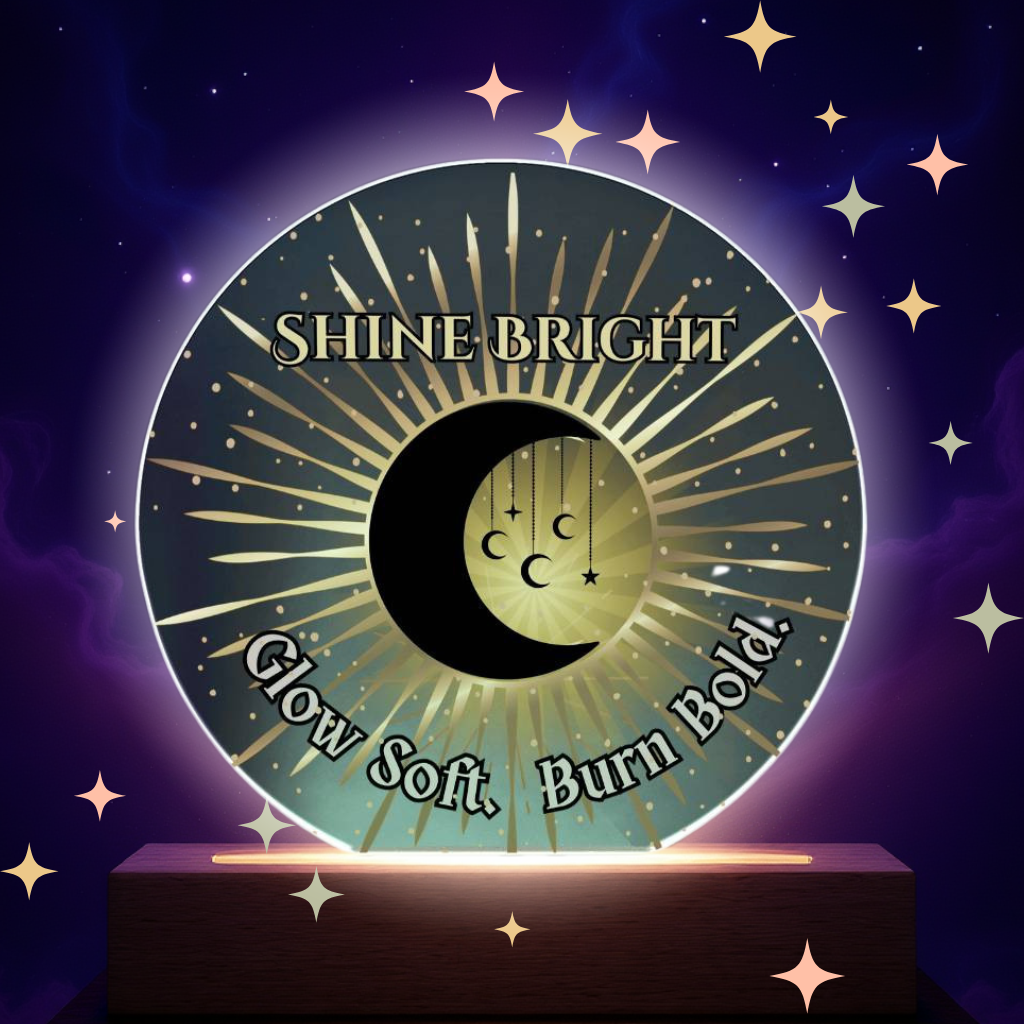 Let your light rise with purpose. This radiant moon-and-sun design reminds us to shine with intention—soft enough to soothe, bold enough to inspire. The warm celestial theme pairs a glowing crescent moon with golden beams, symbolizing balance between reflection and power.