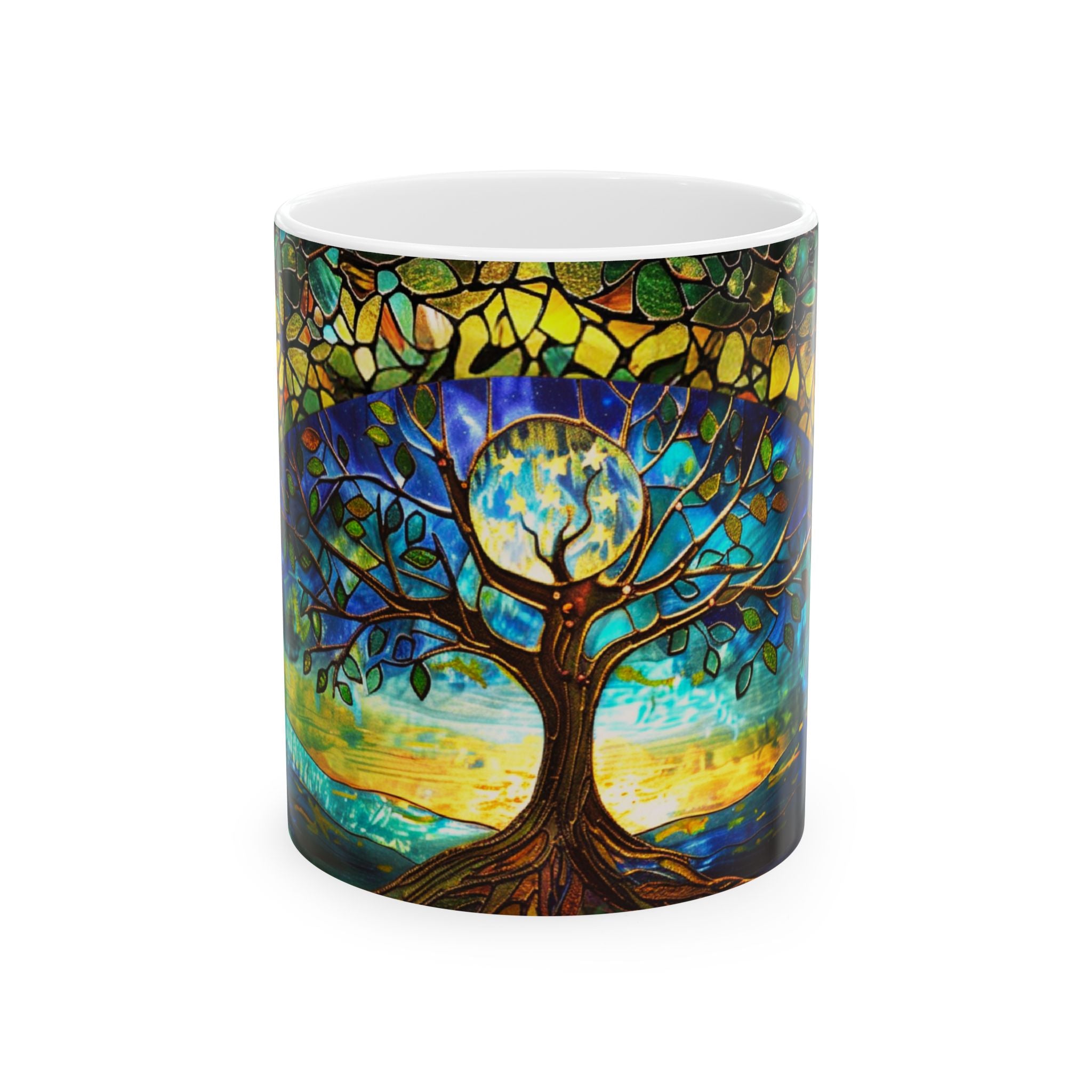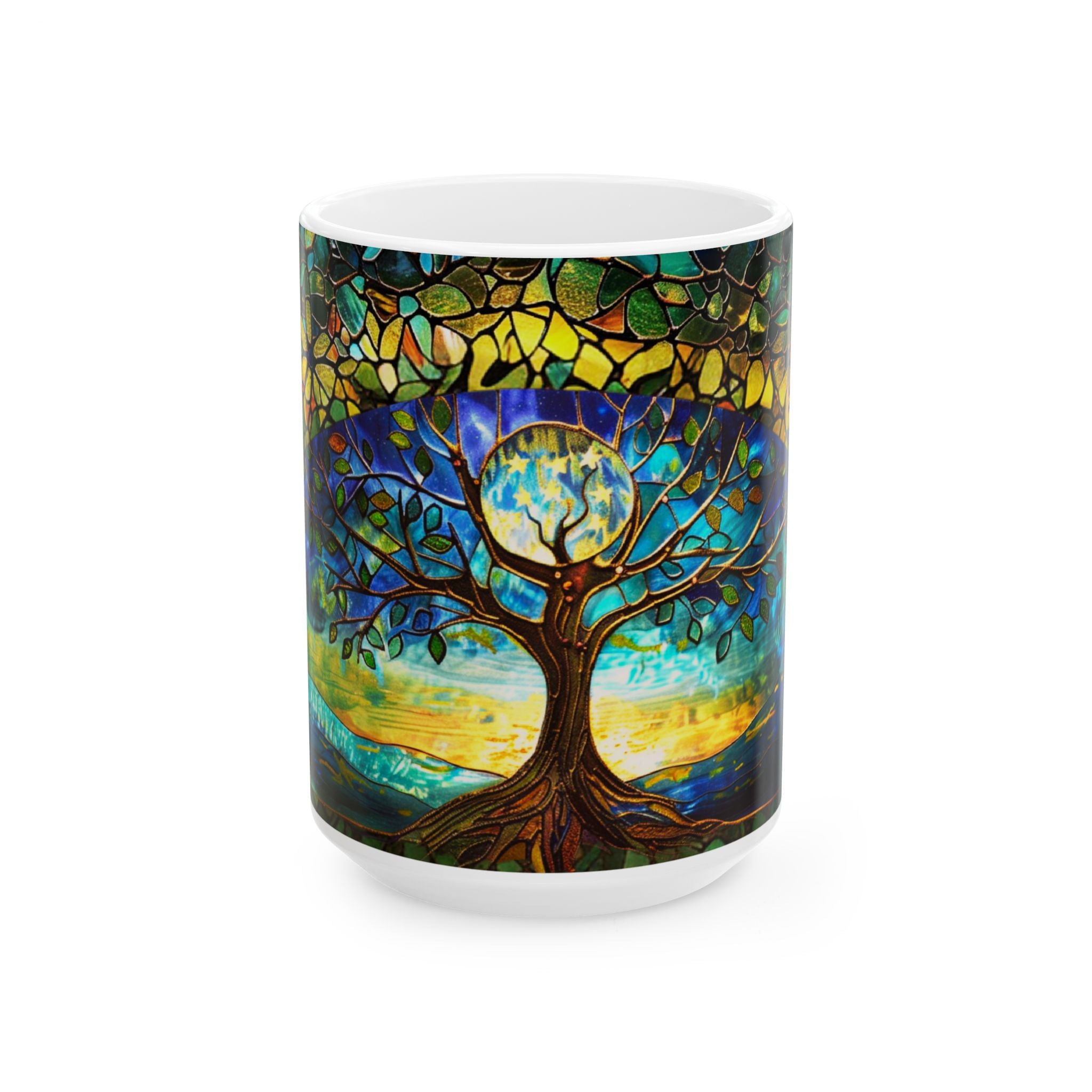 Bring luminous artistry into your daily ritual with this stained glass–look mug, featuring a radiant Tree of Life design that glows with deep blues, greens, and golden mosaic accents. Intricate branches, vibrant leaves, and a softly illuminated sky create the illusion of handcrafted stained glass—while the surface remains smooth, durable, and easy to use.