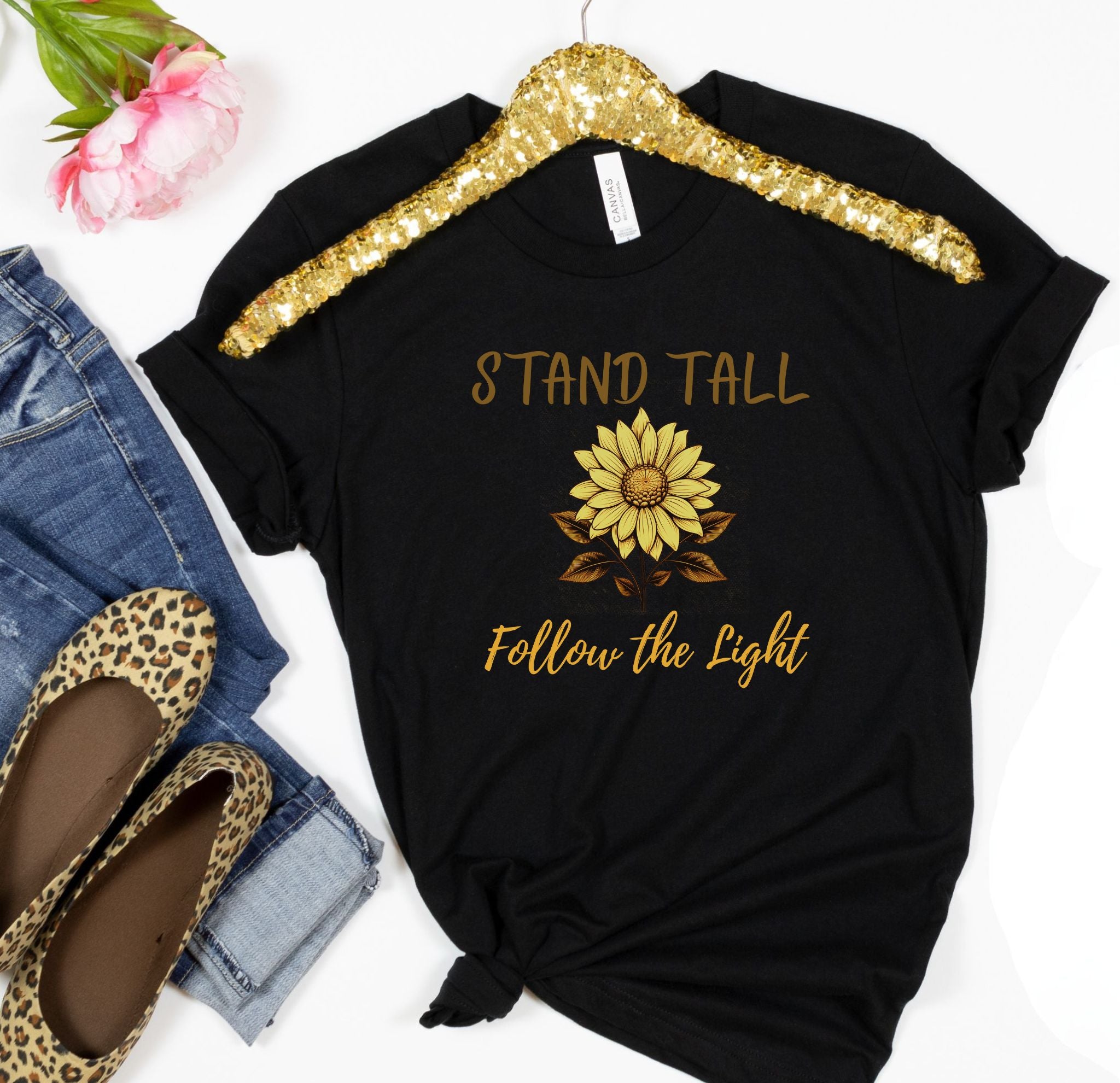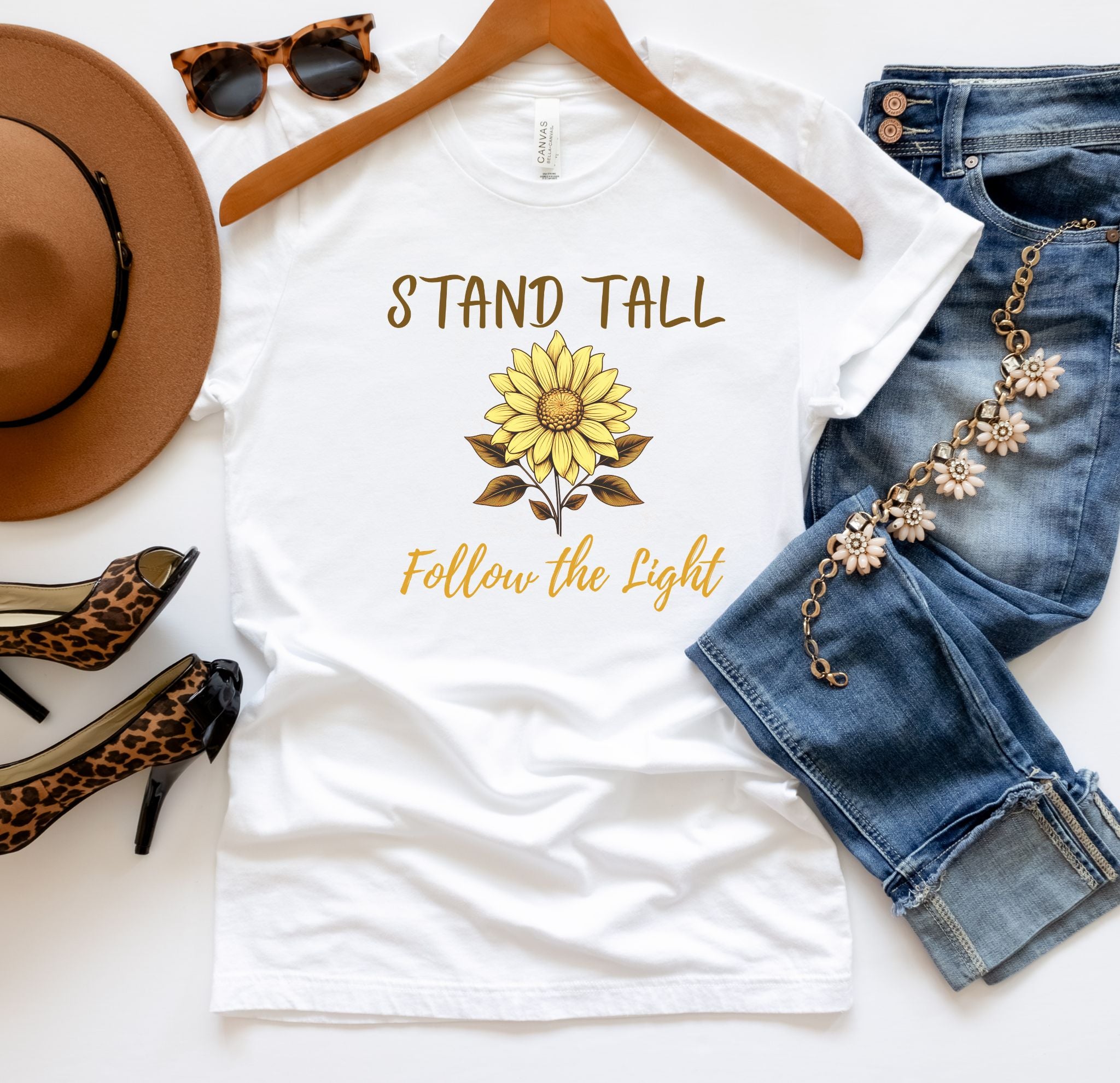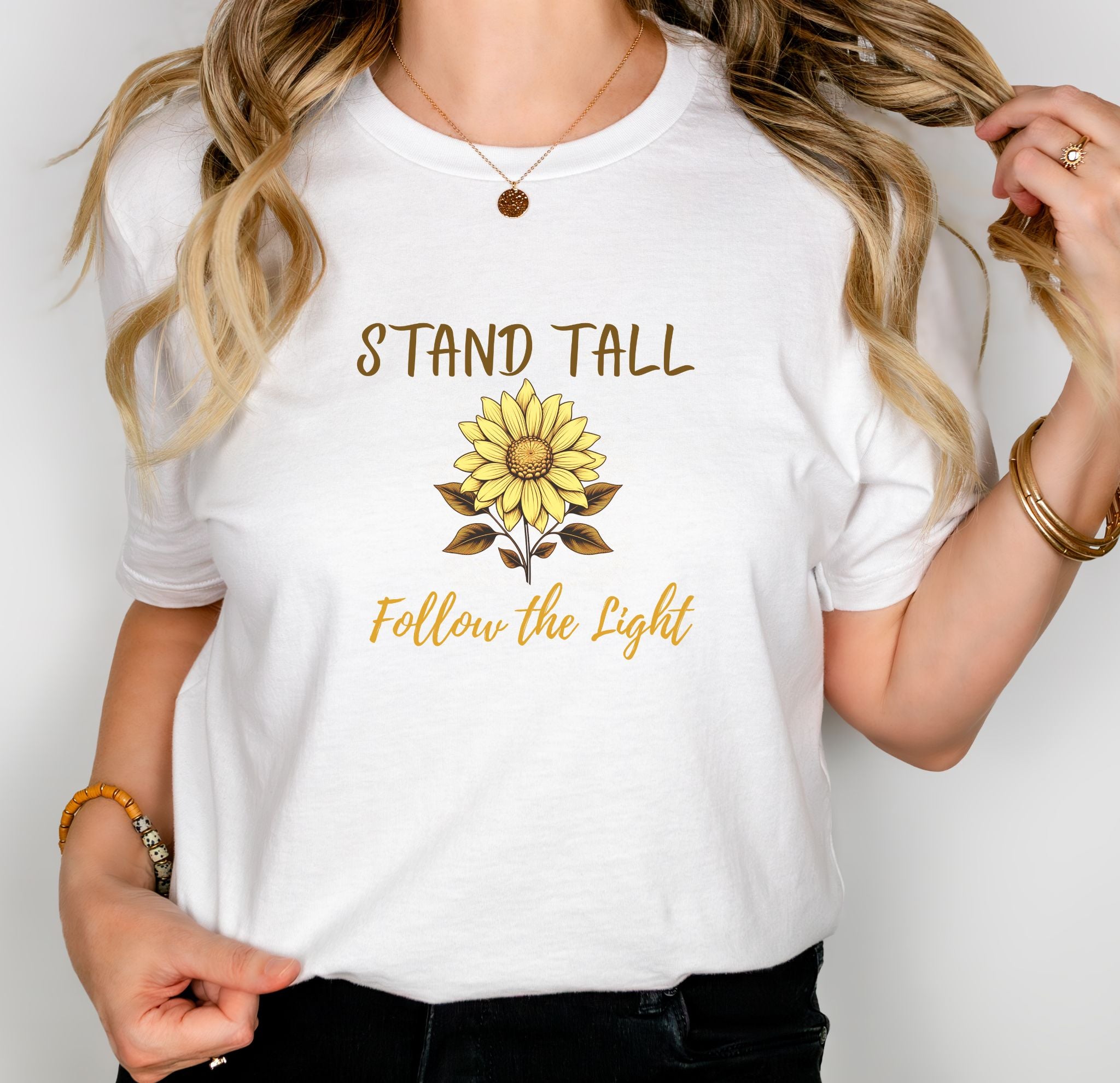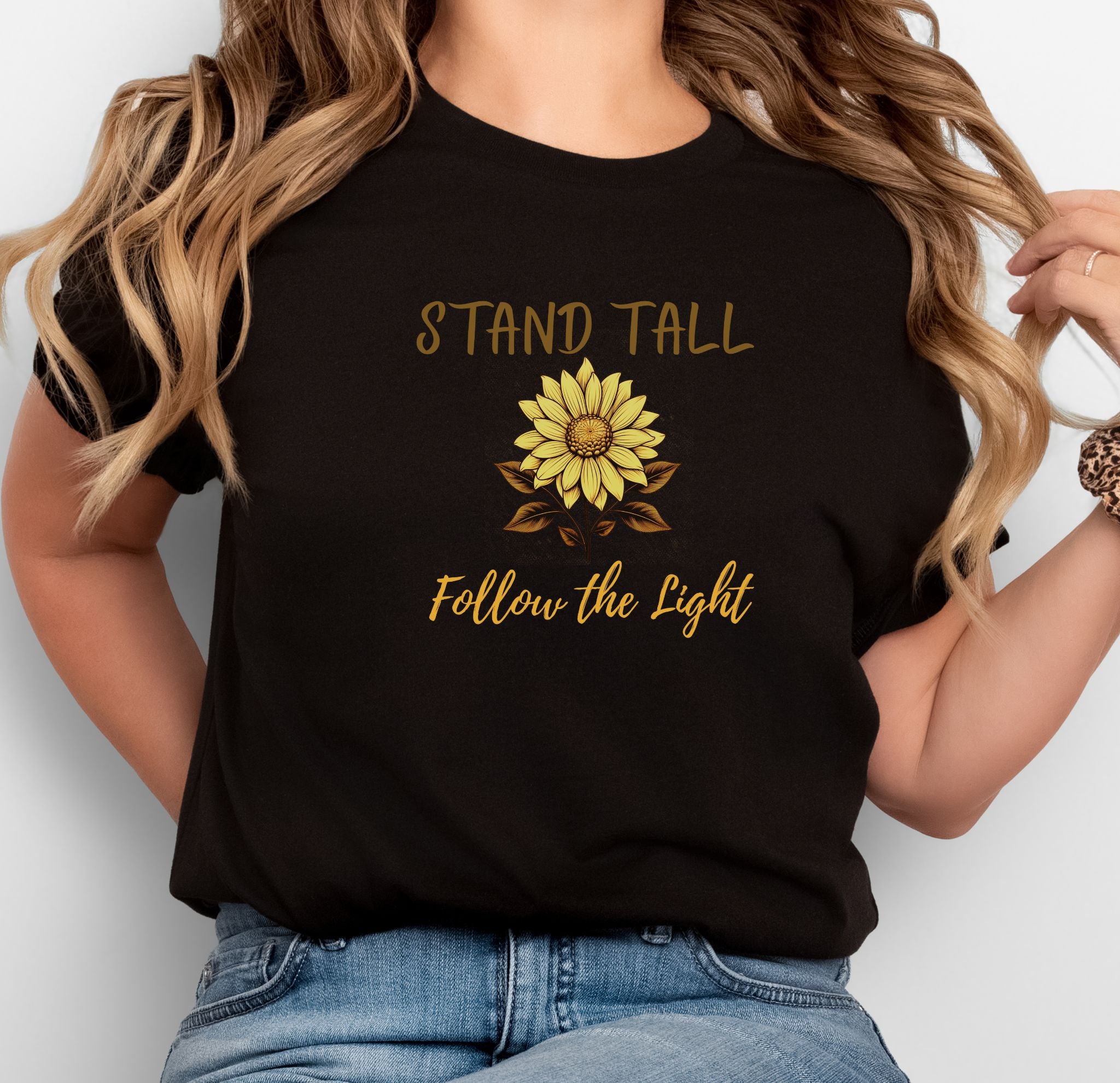 The front reads “Stand Tall” above and “Follow the Light” below the sunflower, while the back features a smaller version of the sunflower at the nape — a subtle reminder to always seek the sun, even on cloudy days.