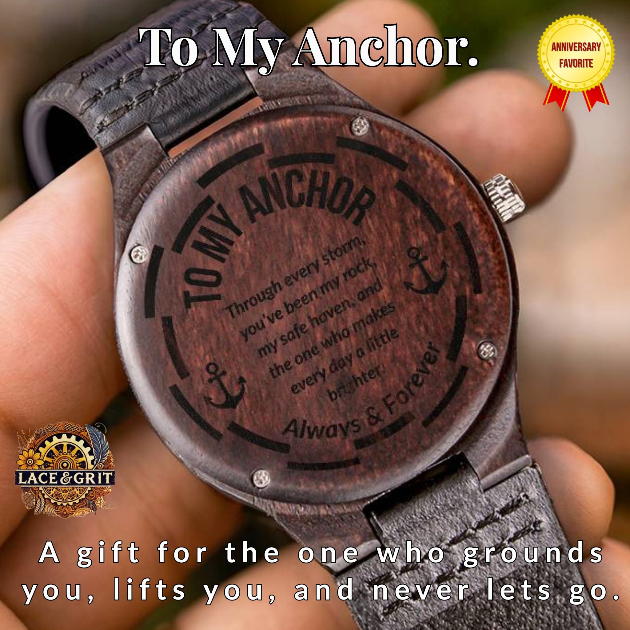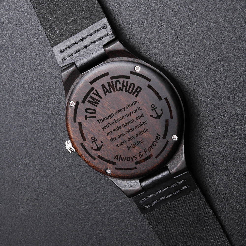 This engraved wooden watch isn’t just a keepsake—it’s your heart, your story, your love. Featuring the heartfelt words “Through every storm, you've been my rock, my safe haven, and the one who makes every day a little brighter,” this timepiece makes a powerful gift for anniversaries, birthdays, or simply because he deserves to feel appreciated.