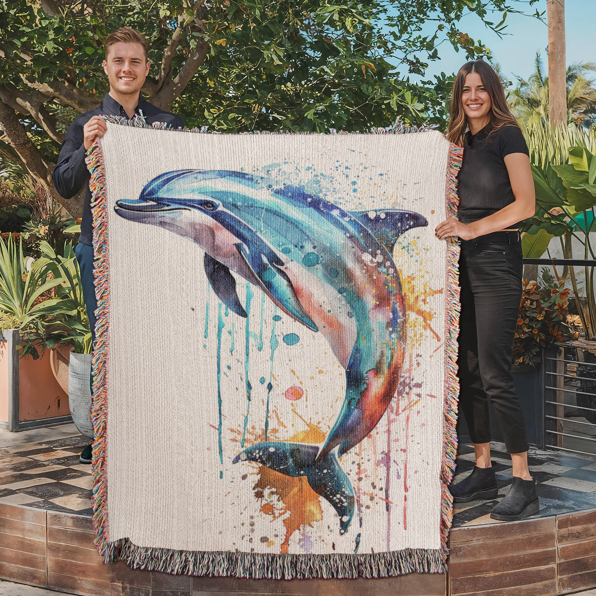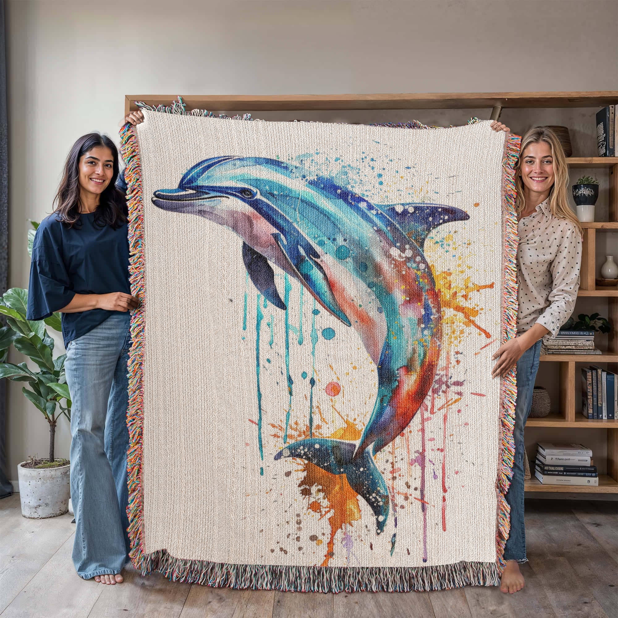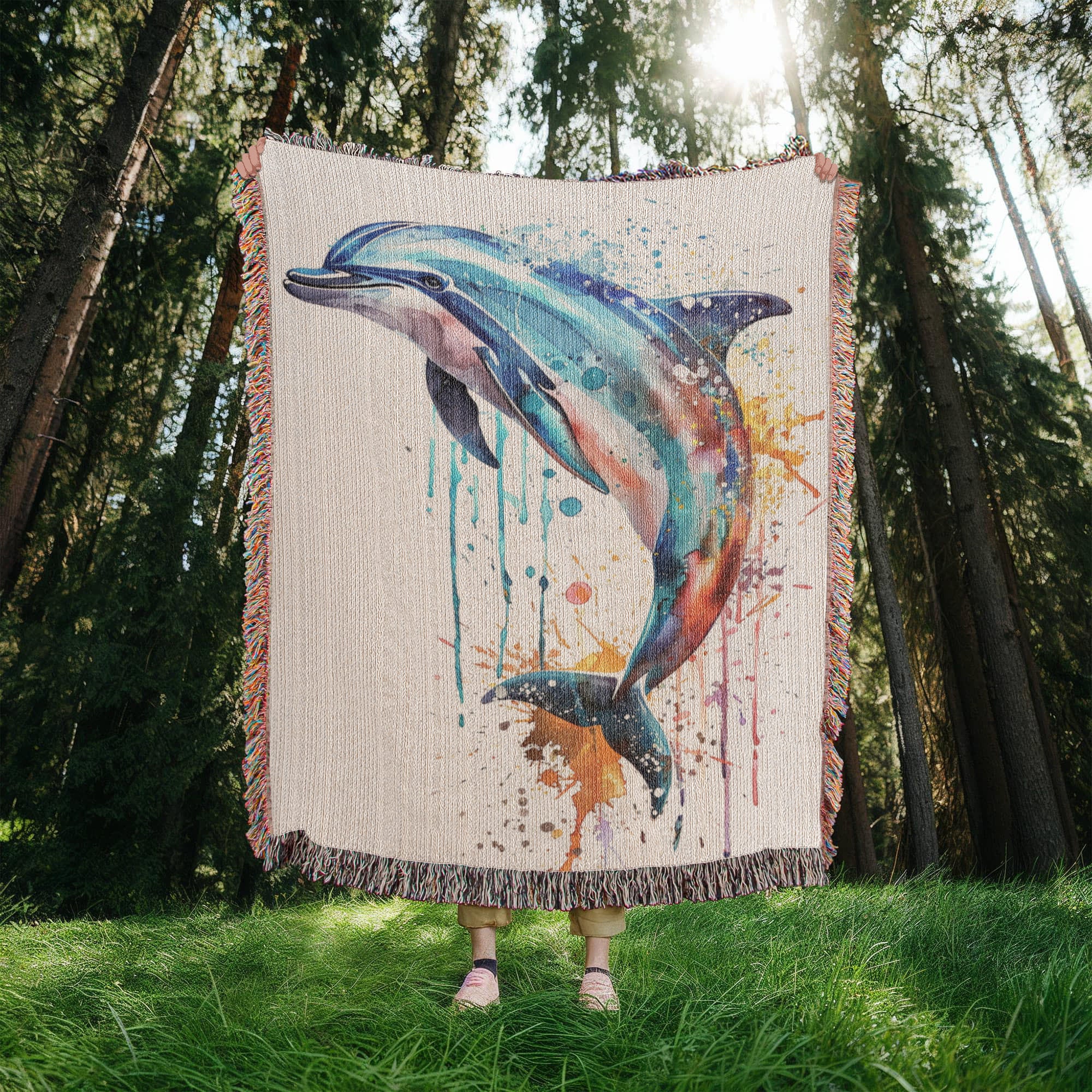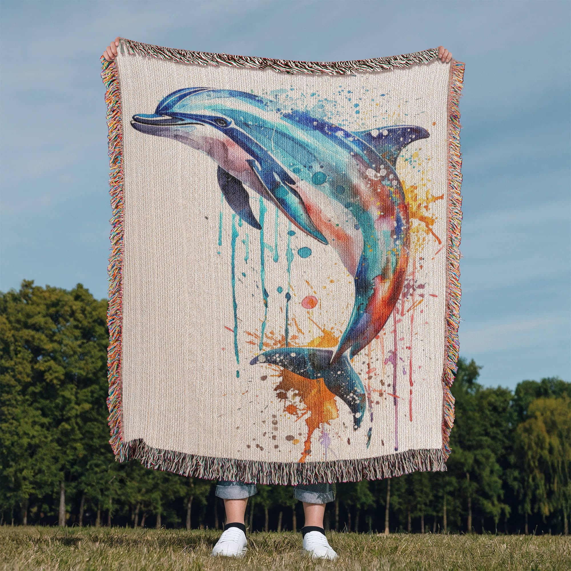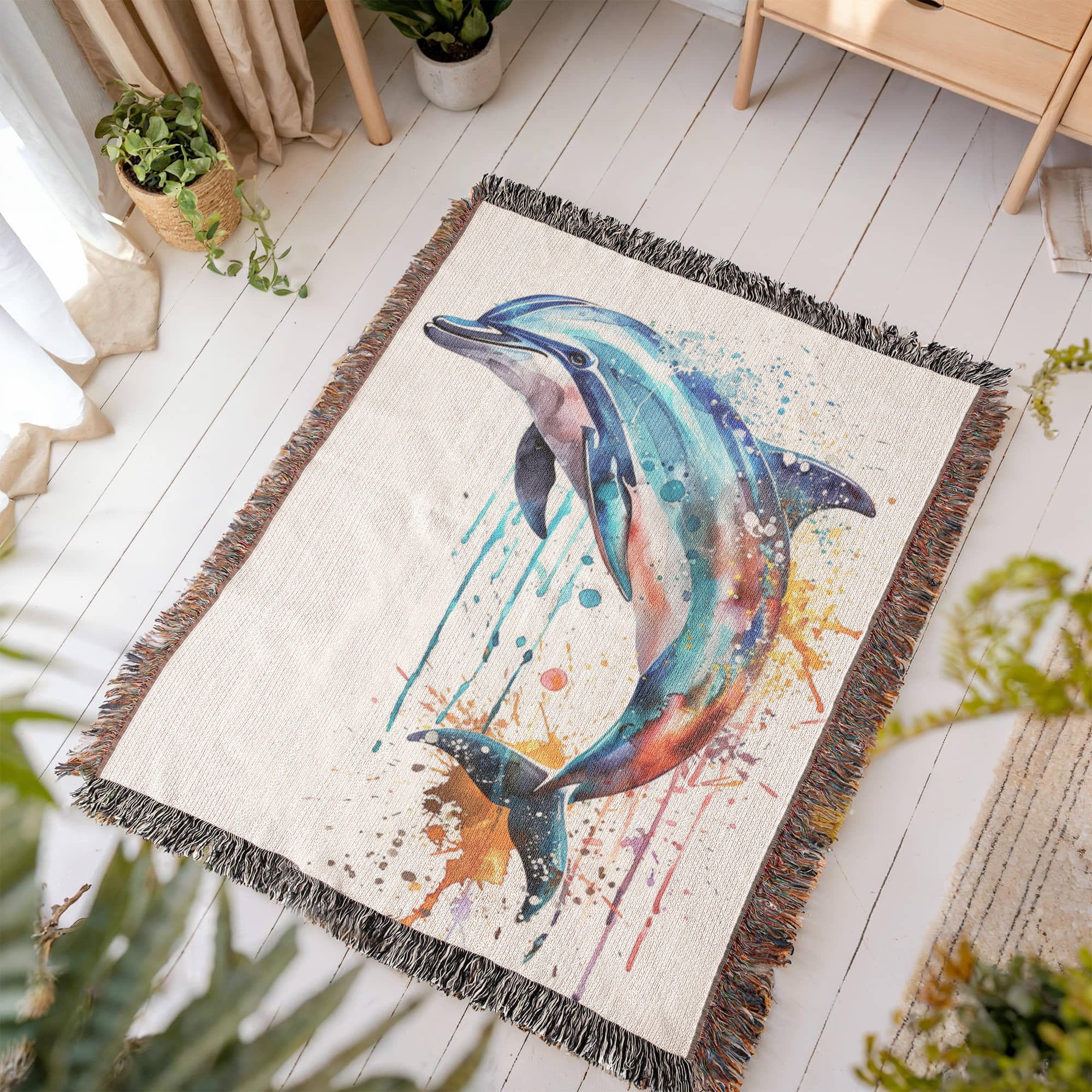 Energized by the sea and shaped by the current, the Tidewater woven blanket features a dolphin mid-leap, captured in vibrant watercolor motion. Shades of aqua, coral, indigo, and violet swirl through its form, with expressive paint drips that echo waves and freedom. This piece brings a fresh sense of fluidity and joy to any space.