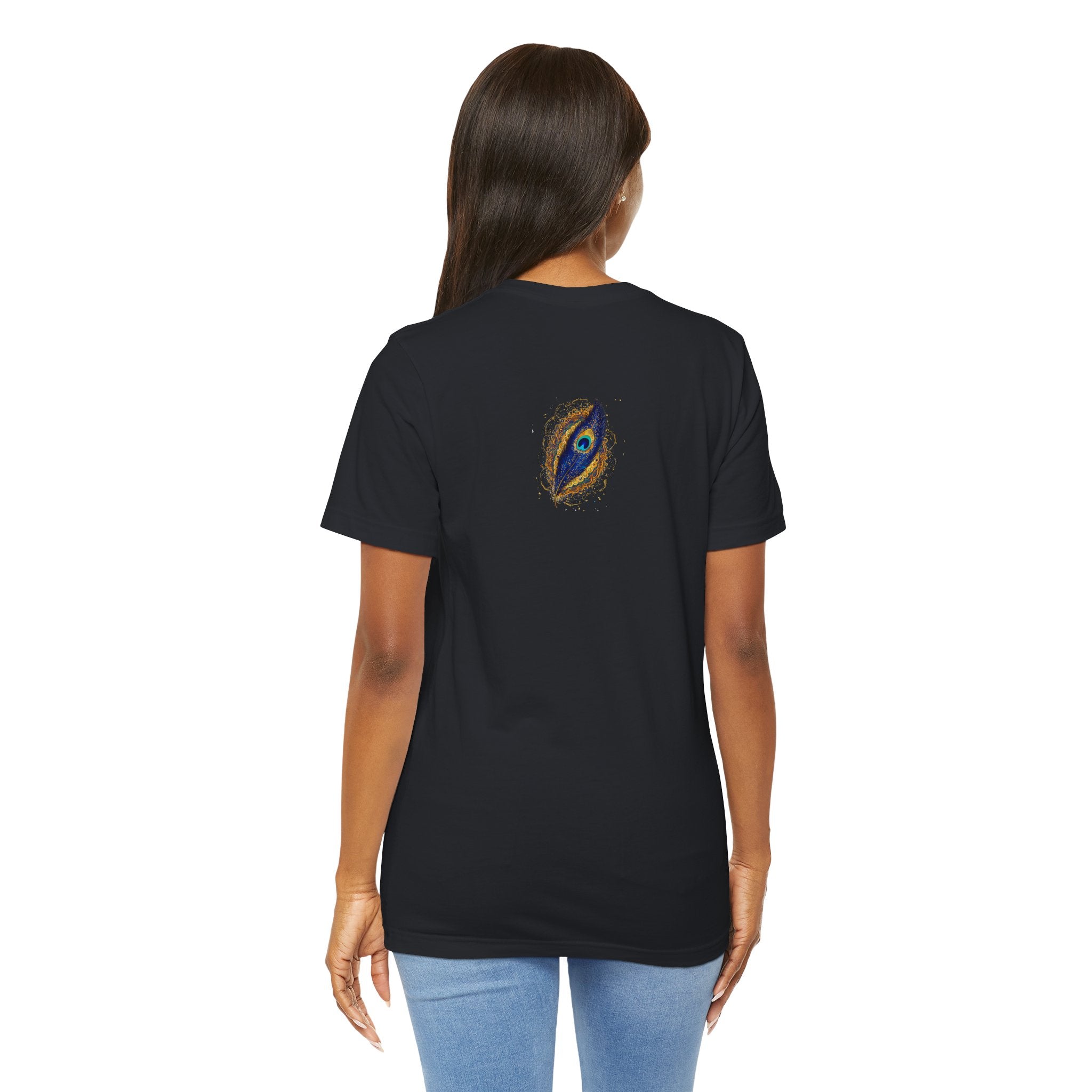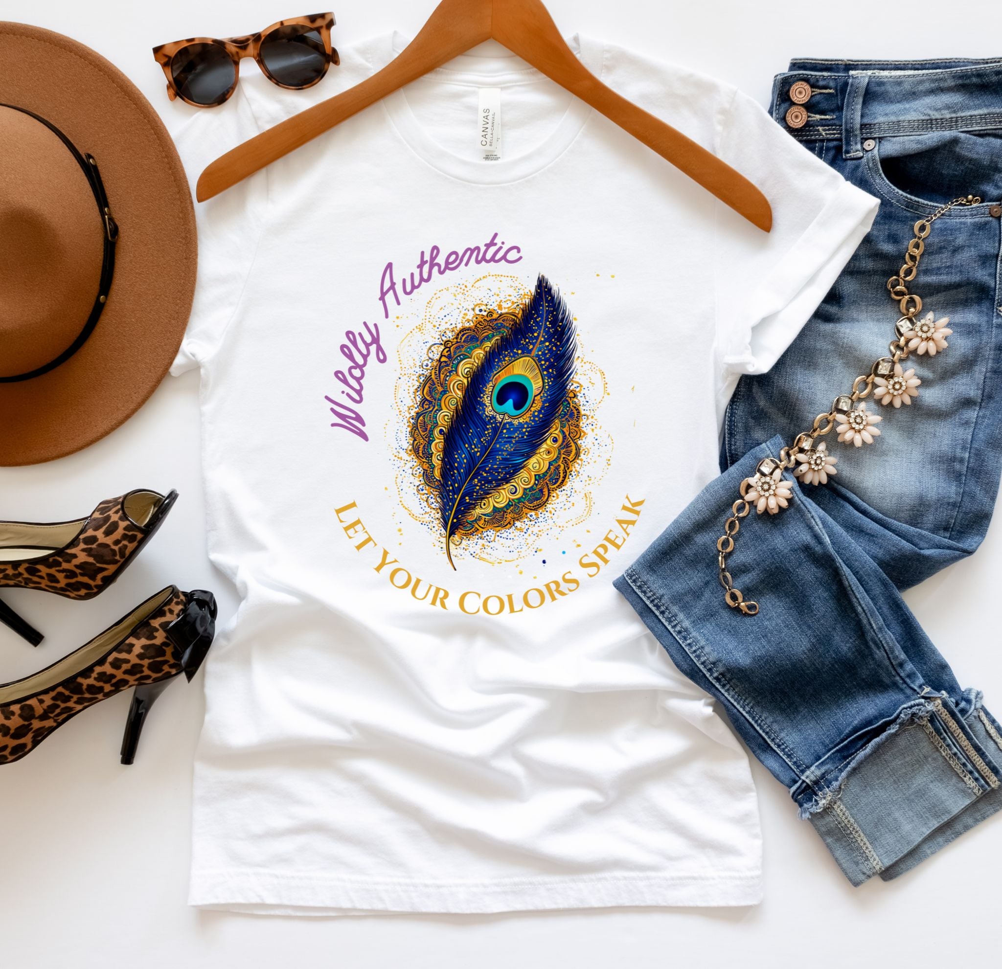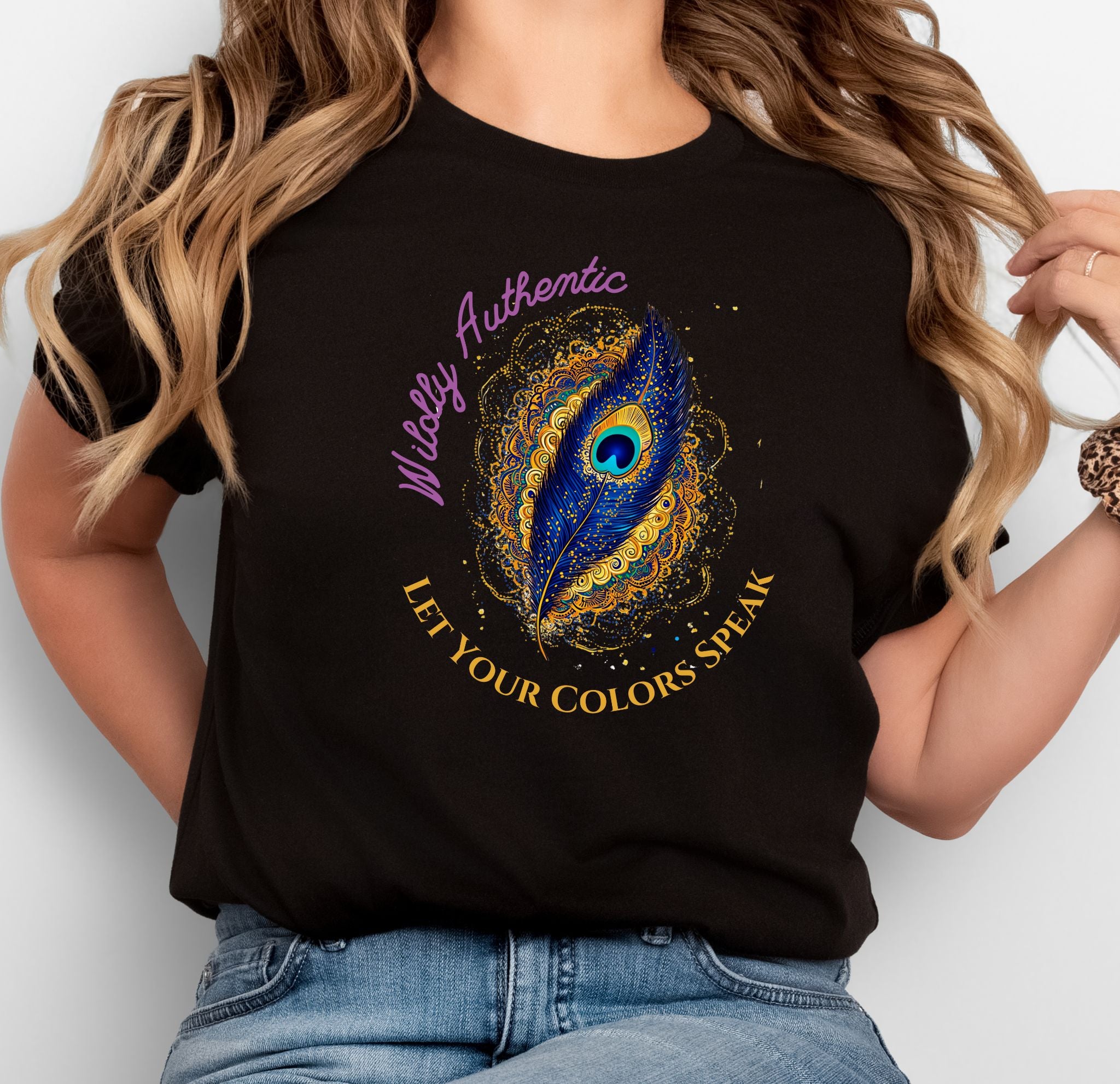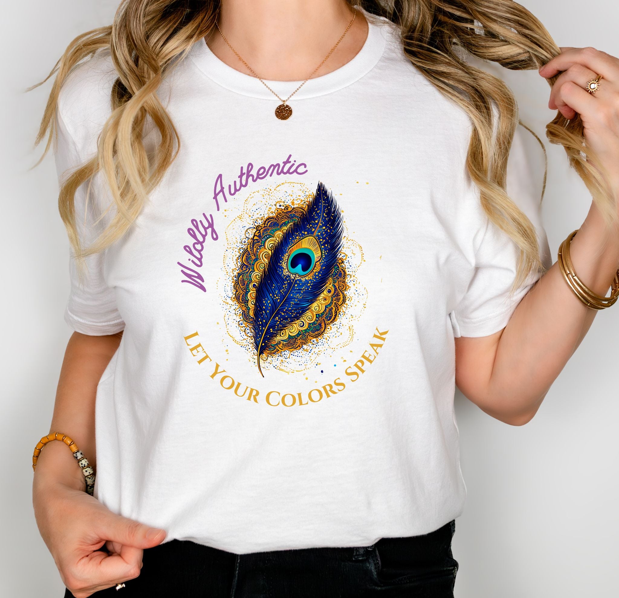 🦚 Wildly Authentic · Let Your Colors Speak This peacock-inspired tee is a radiant declaration of individuality. With shimmering hues and intricate detail, the feather design bursts with symbolism—beauty, confidence, and divine uniqueness. The front boldly states your truth, while the back carries a small centered feather as a whisper of elegance.